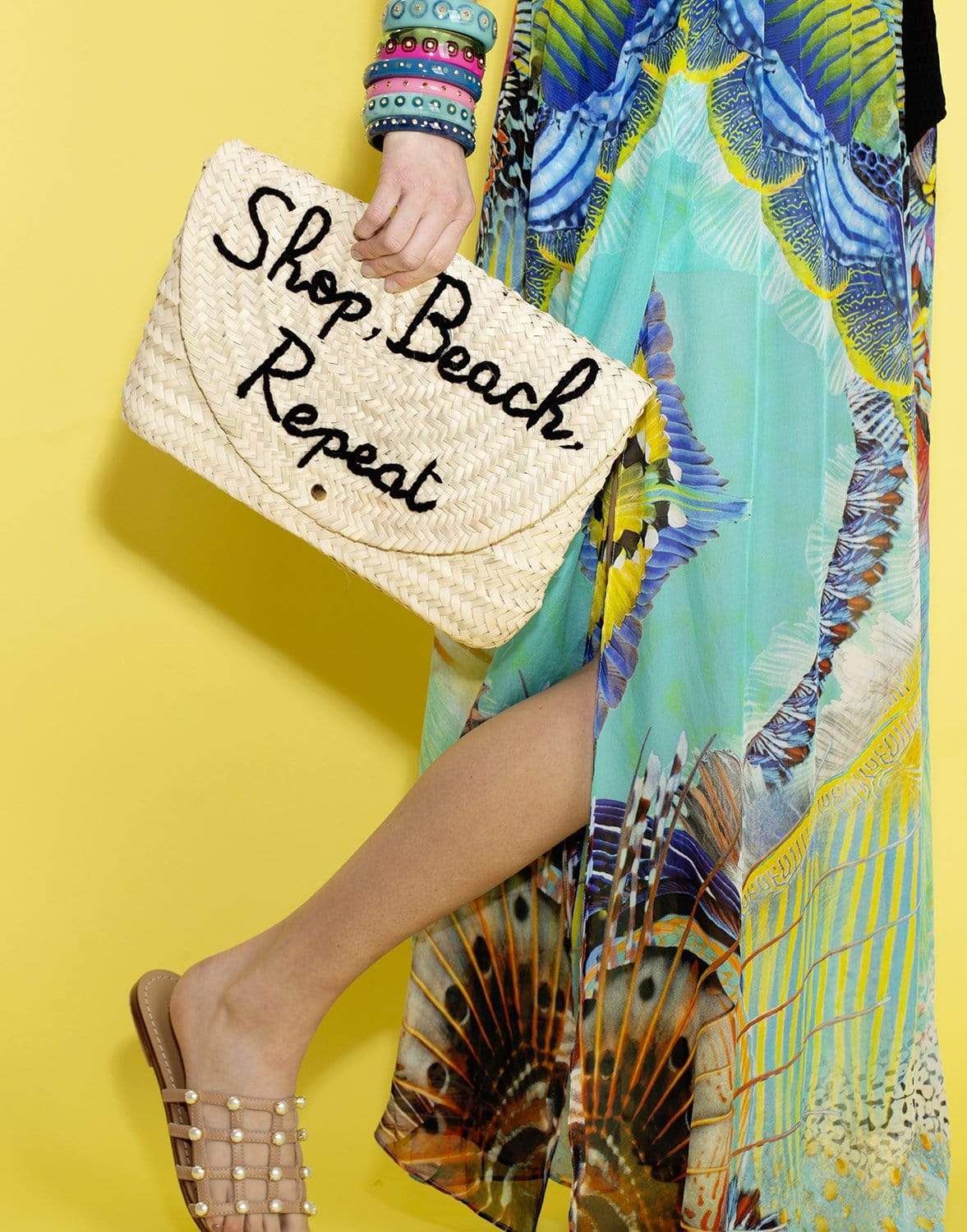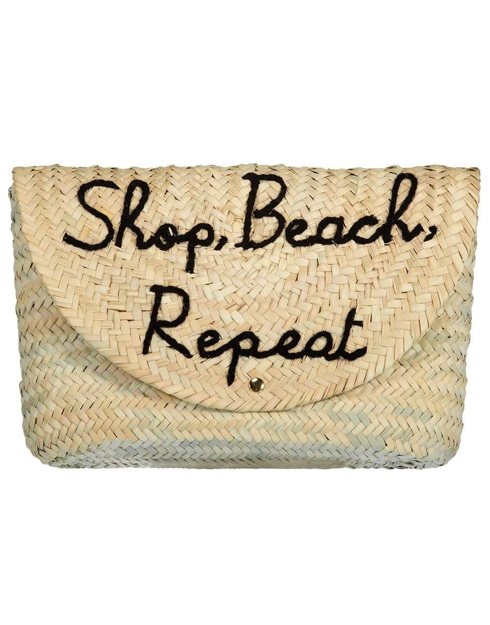 Poolside "Shop, Beach, Repeat" Clutch handcrafted from raffia with an envelope silhouette and snap closure.