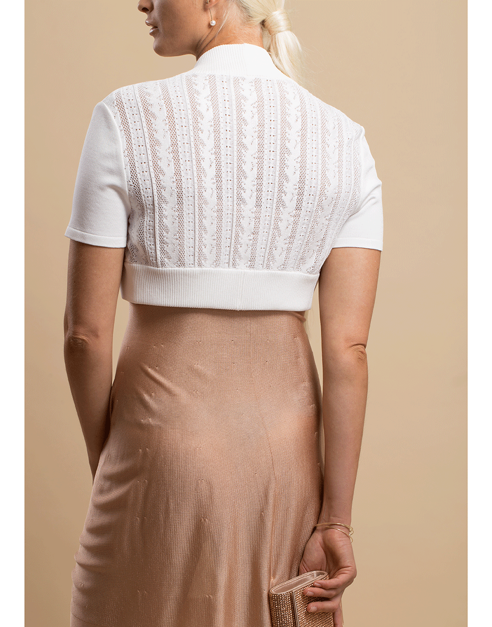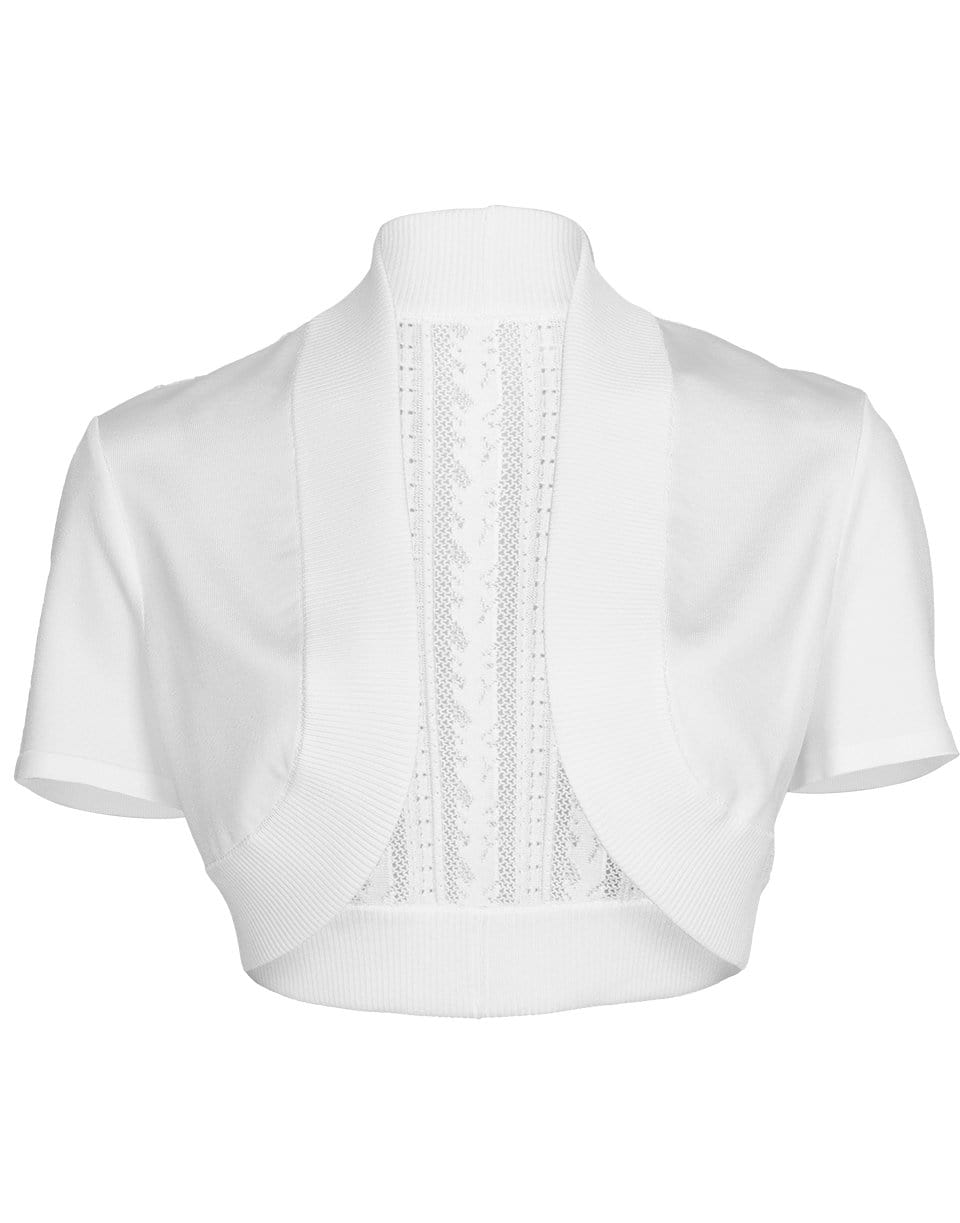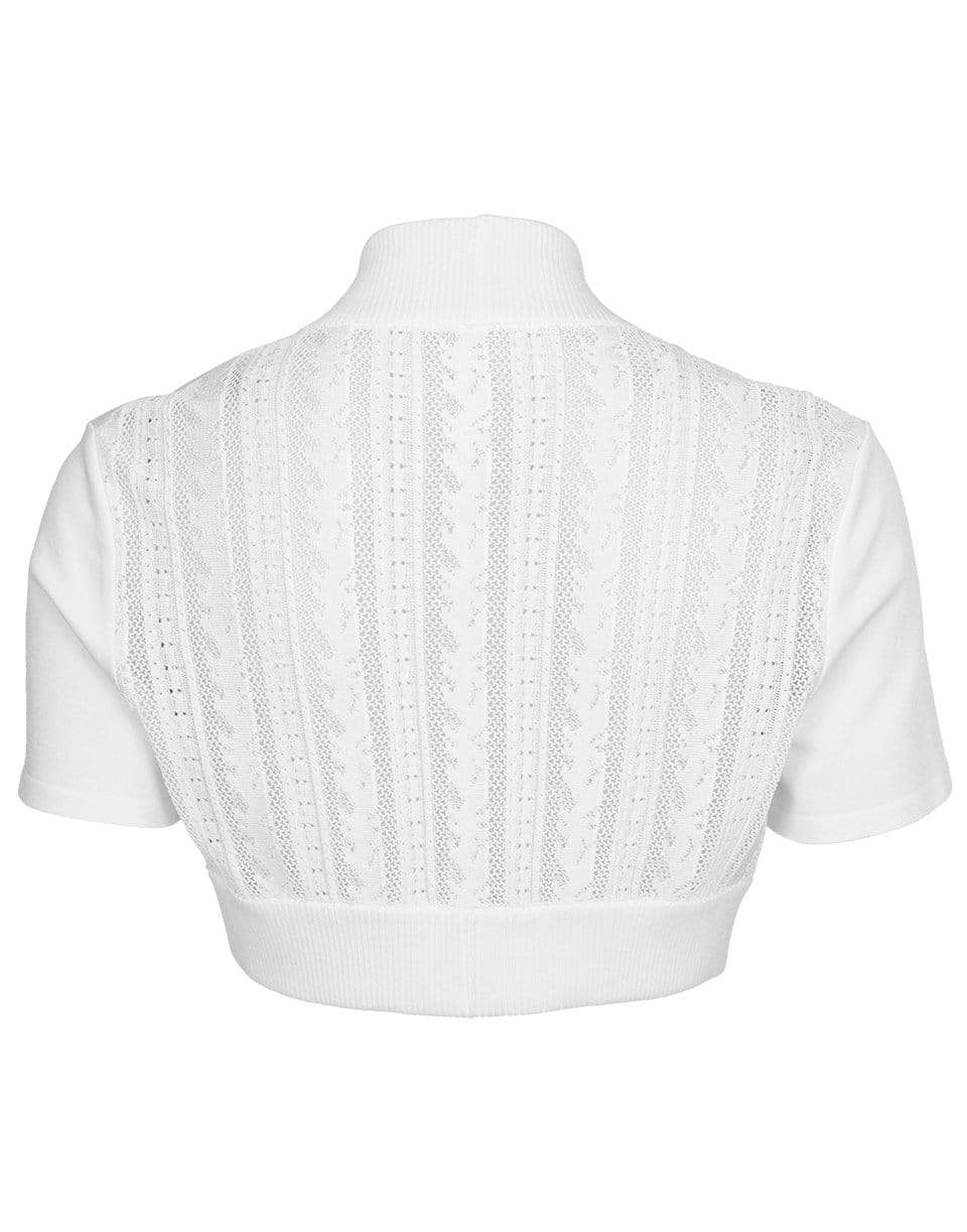 Alaia short sleeve bolero with a slim fit, open design, crocheted design at back, ribbed trims, and a cropped length.