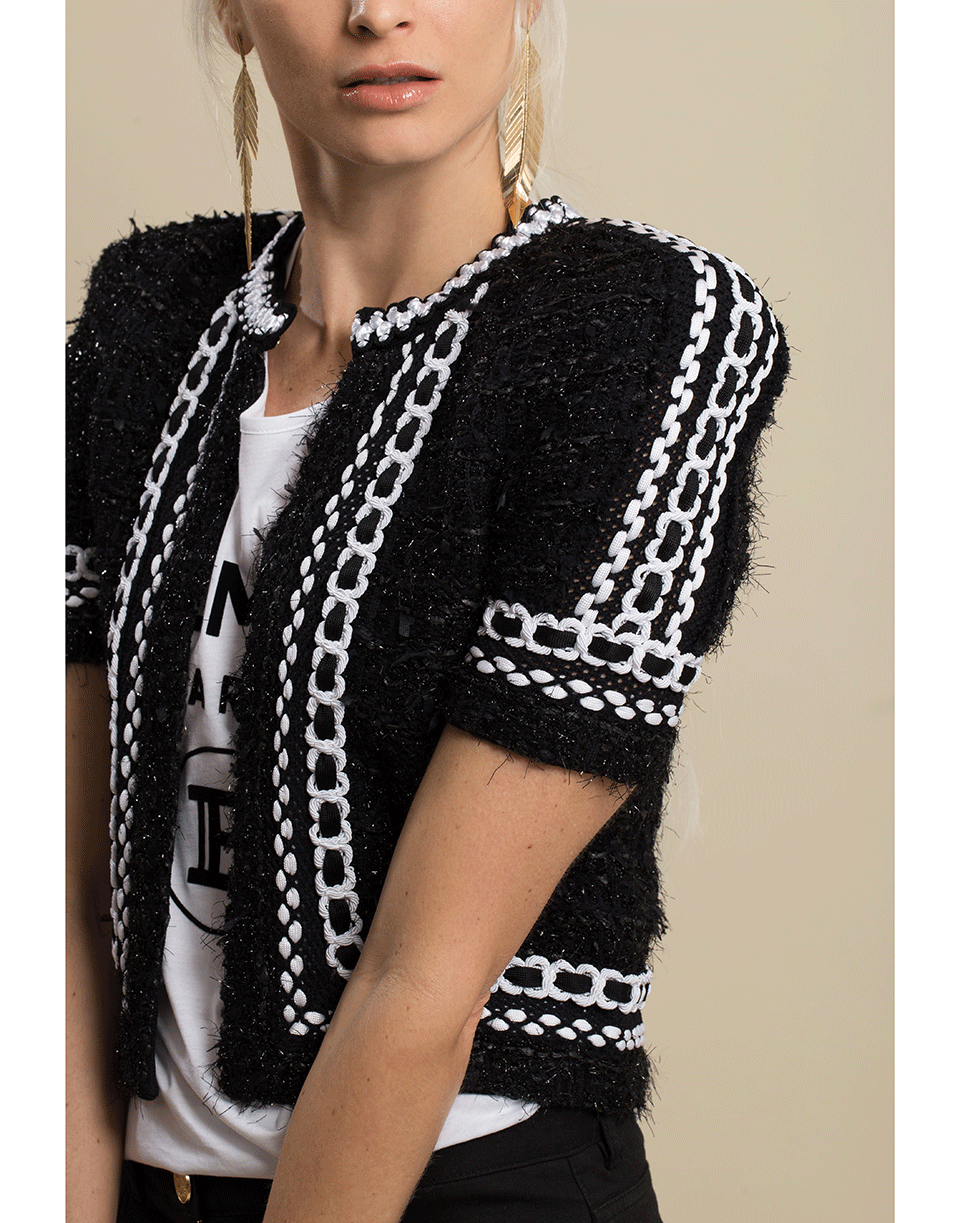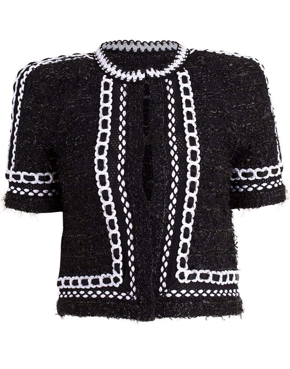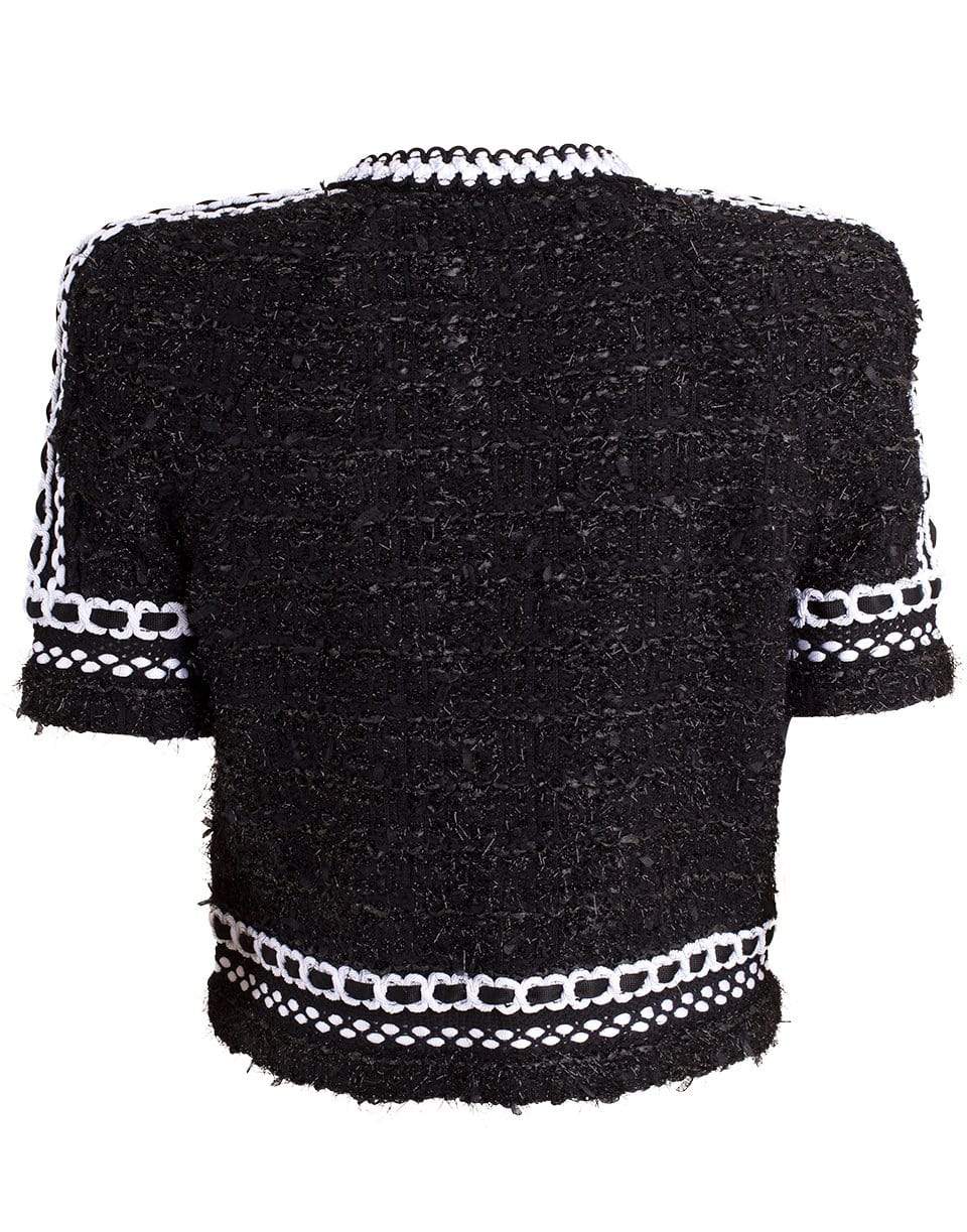 Balmain short sleeve collarless tweed and mesh knit jacket with a structured silhouette, hook and eye closure, and a cropped design,