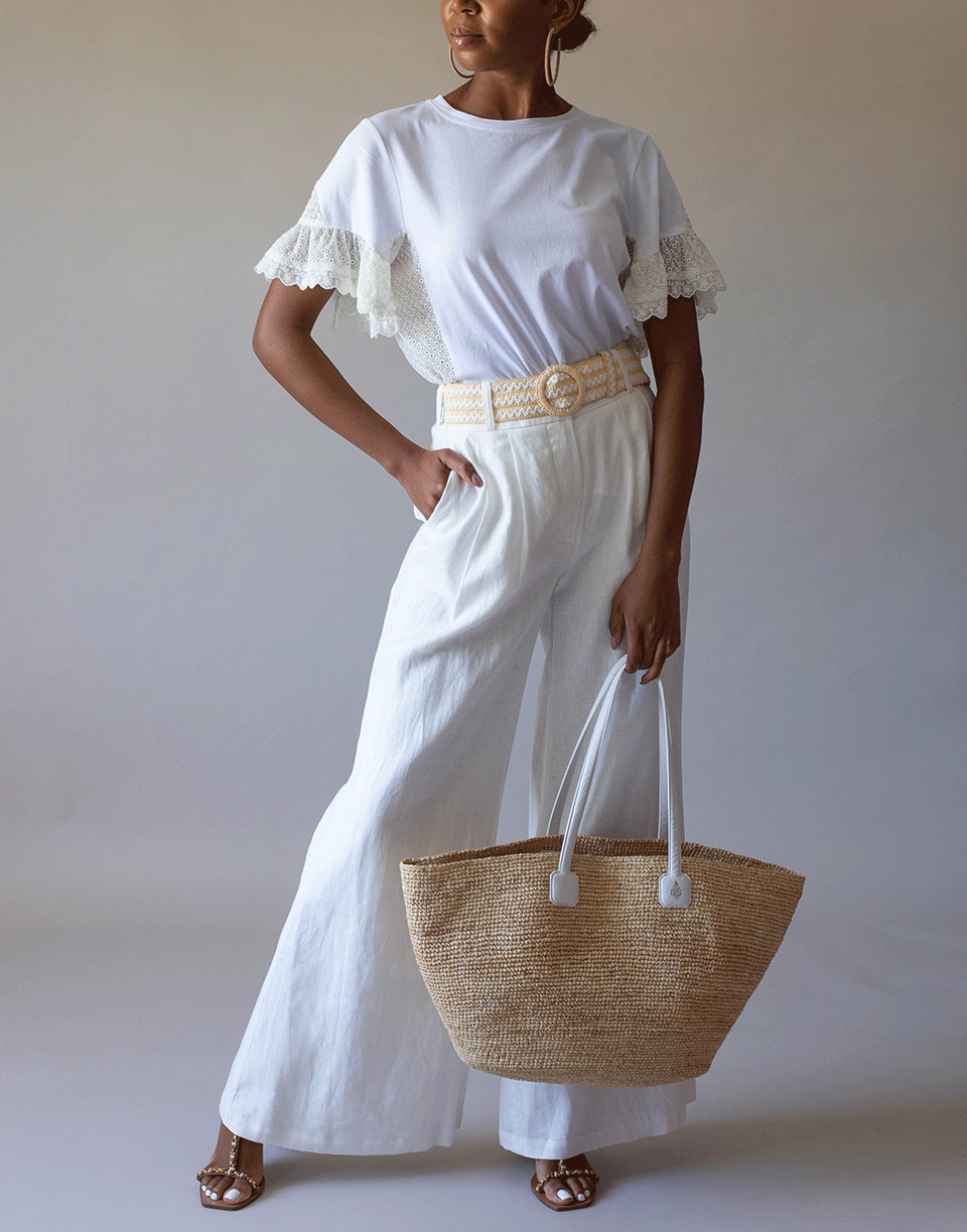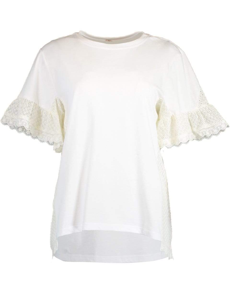 Twin-Set cotton short sleeve tee with macramé trim, crewneck, ruffle detail along the back, and a regular fit.