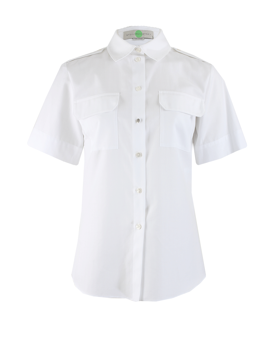 A classic tailored style with a modern edge, this short sleeve maida shirt with pocket by Stella McCartney is perfection for work or play. Pair it with anything from a pencil skirt and stilettos to coated denim and chunky platforms.