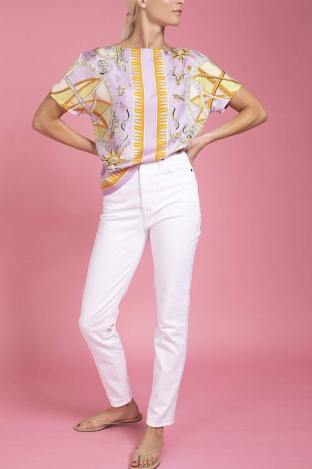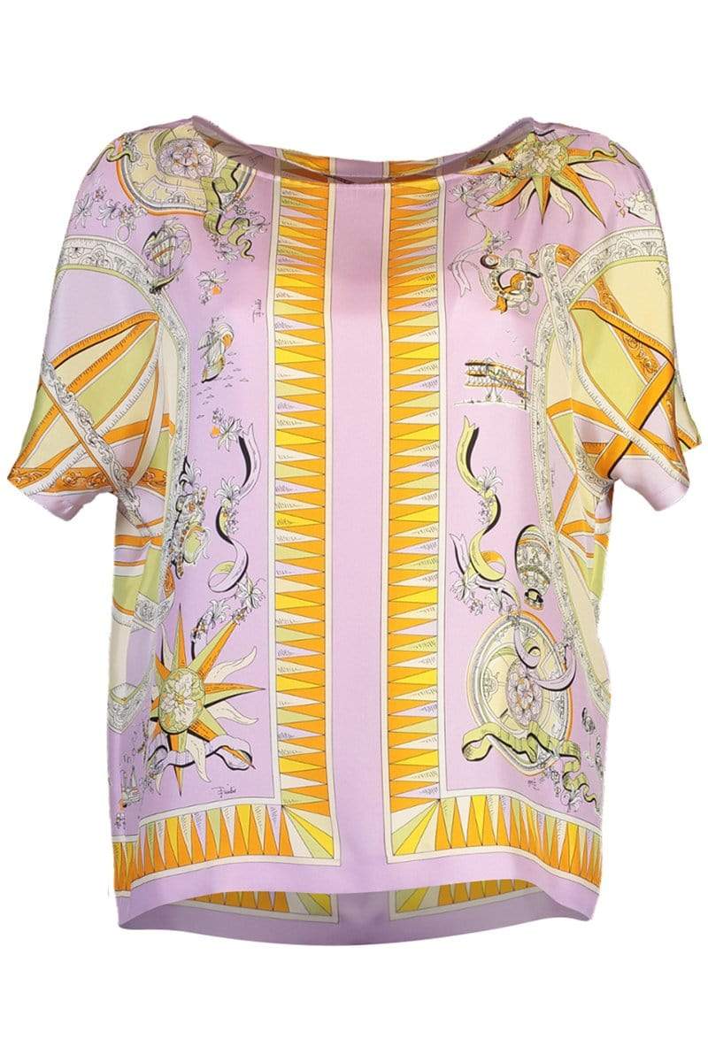 Emilio Pucci short sleeve printed wide neck top in white orange.