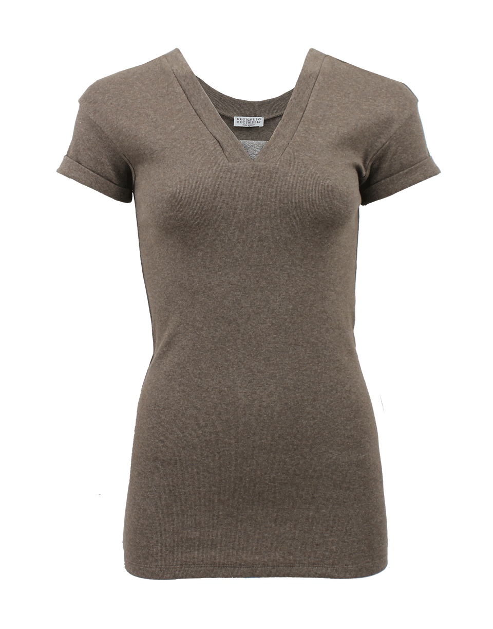 Not your average t-shirt, this Brunello Cucinelli short sleeve ribbed monili collar tee features a bit of extra shimmer. Pair with a pleated skirt and structured blazer for work or play.