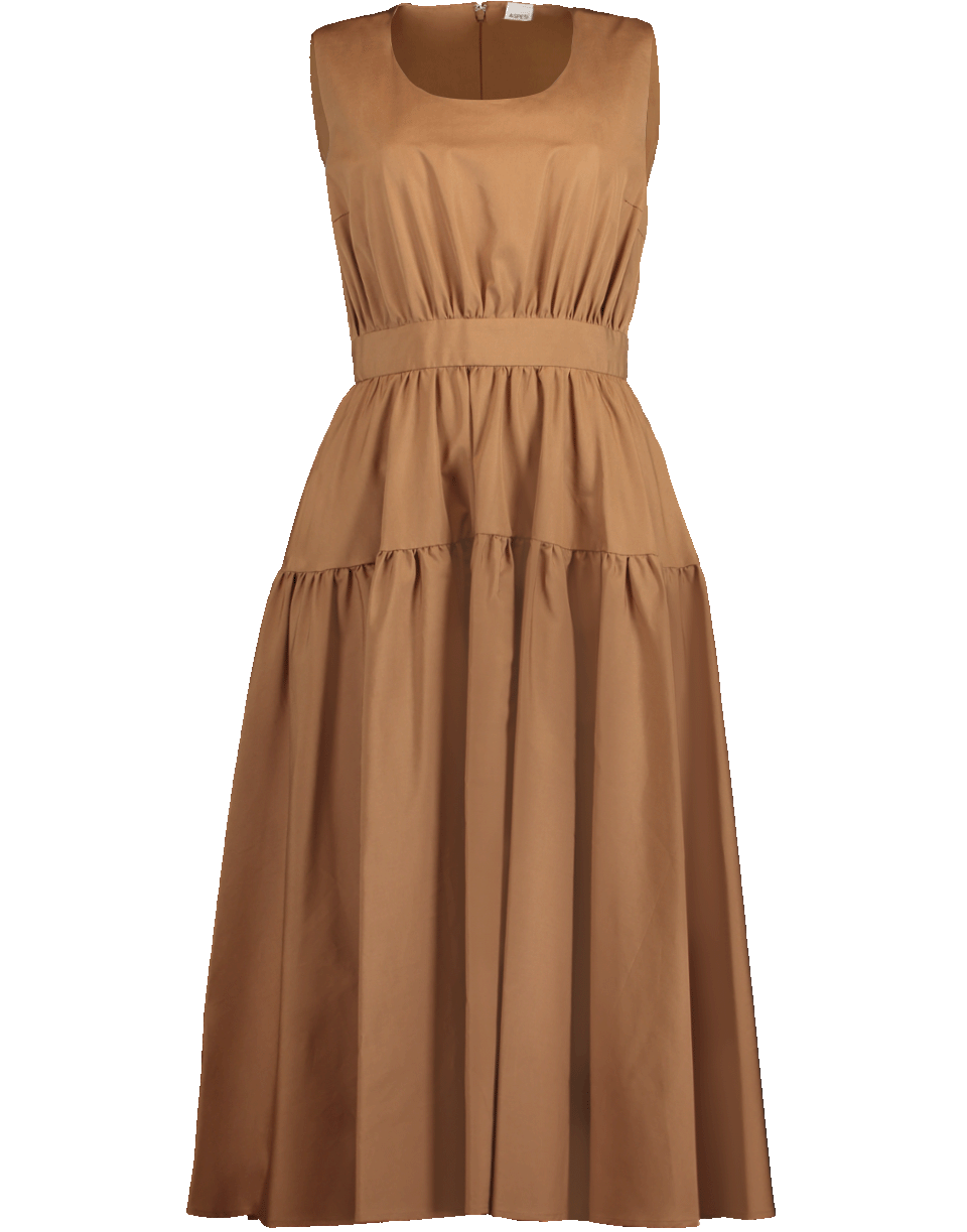Tan sleeveless cotton shirtdress by Aspesi. This midi dress features a sleeveless cut, scoop neckline, pleated full skirt, defined waistband and concealed zip closure at back.