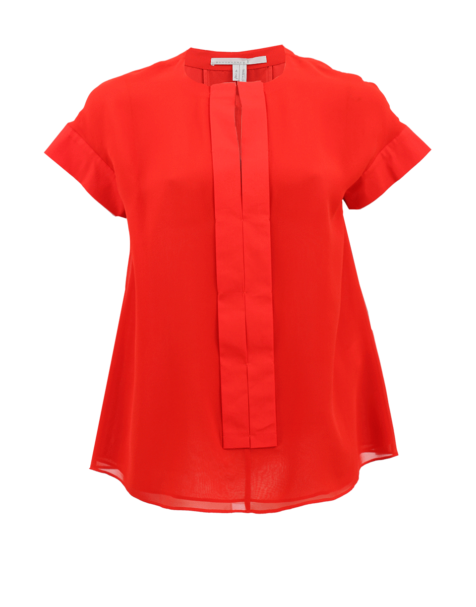 Vibrantly stunning, Schumacher's short sleeve slit neck loose fit top is ravishing. Pair with cropped pants and suede pumps.