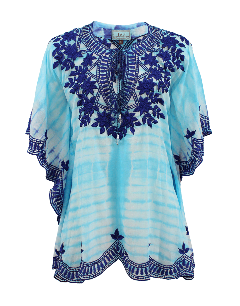 Go for gypsy goddess style in freely flowing comfort in Taj's short sleeve v-neck embroidered tye dye tunic.