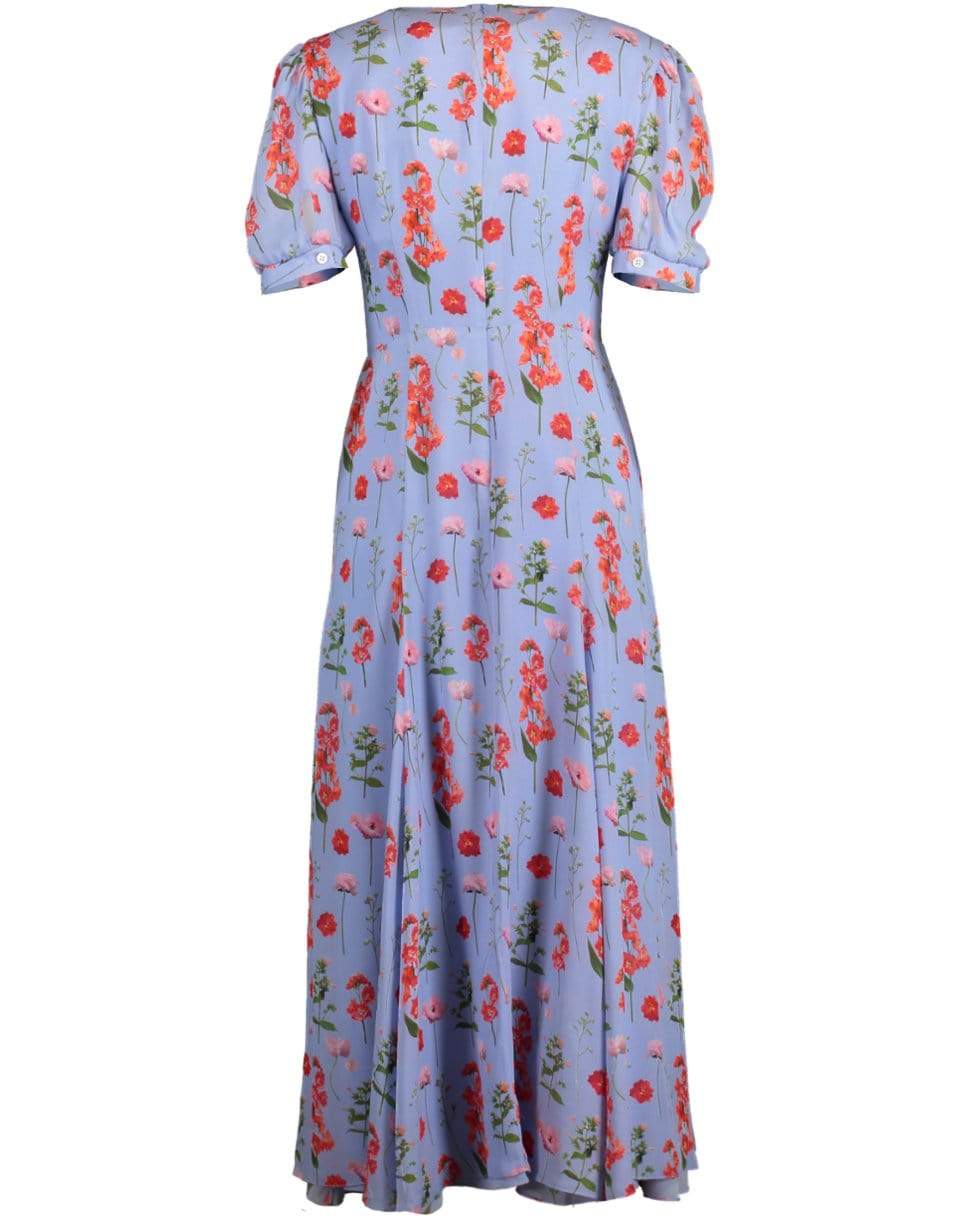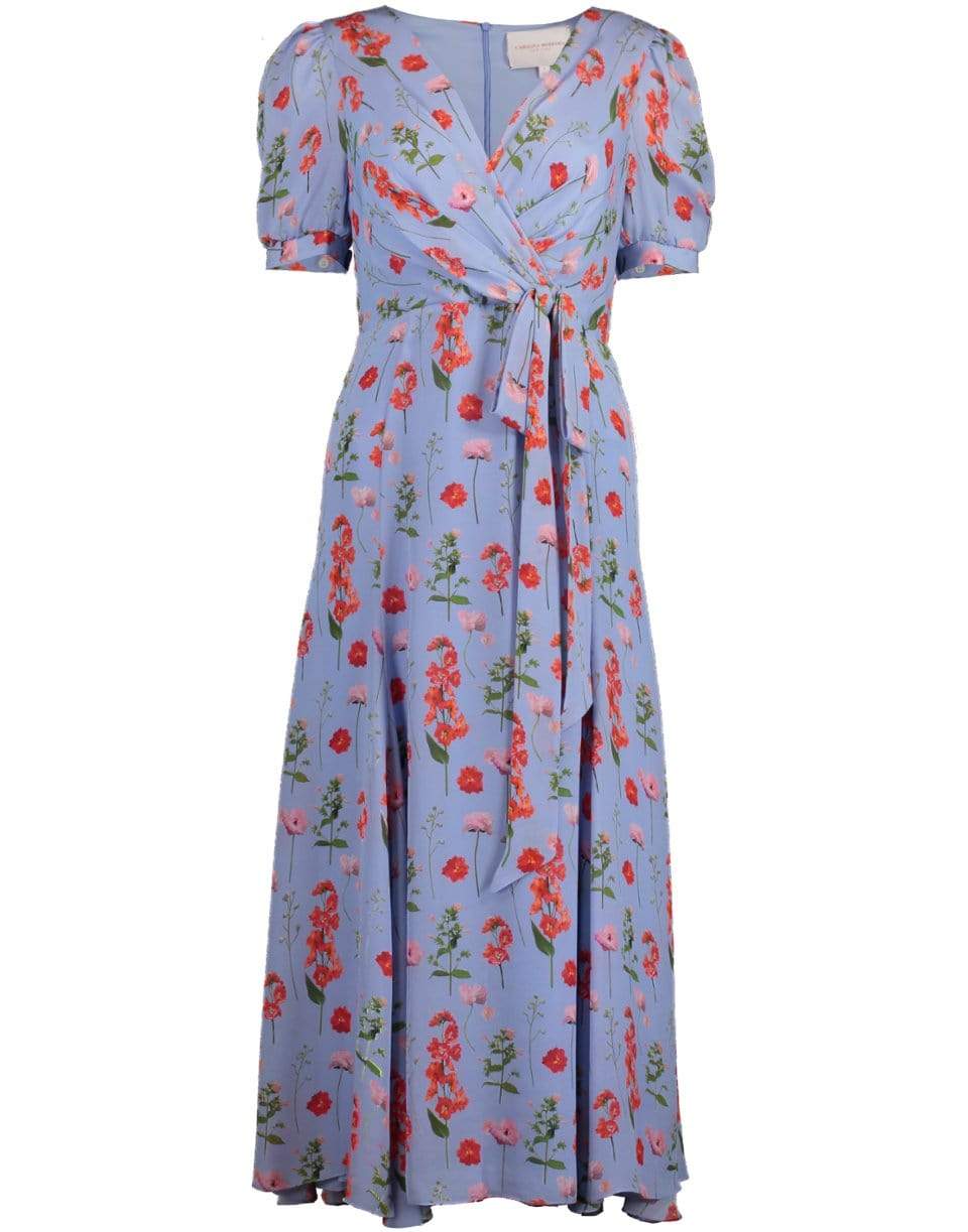 Carolina Herrera floral print wrap dress with a V-neck, short sleeves, back zip closure, and a mid-length.