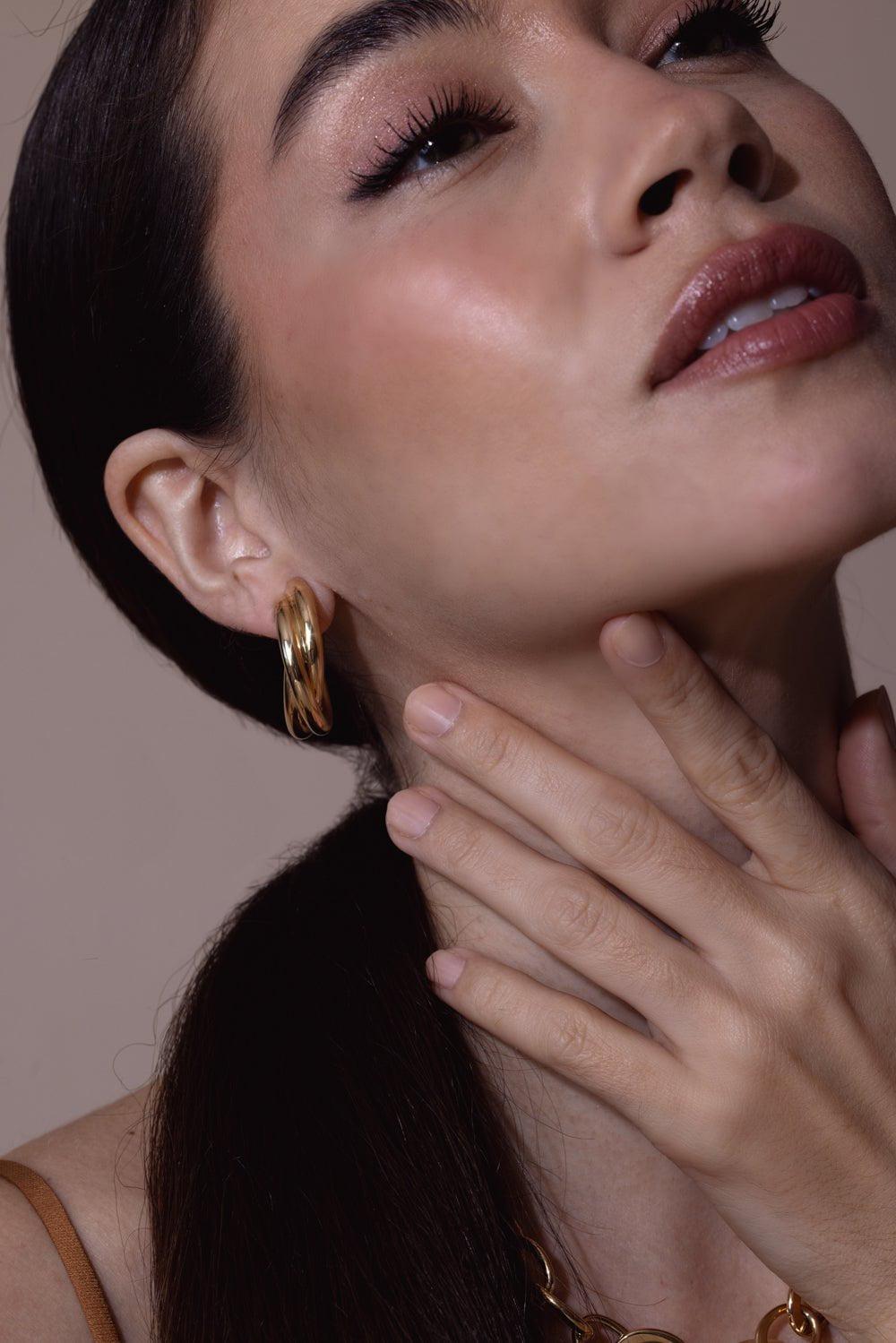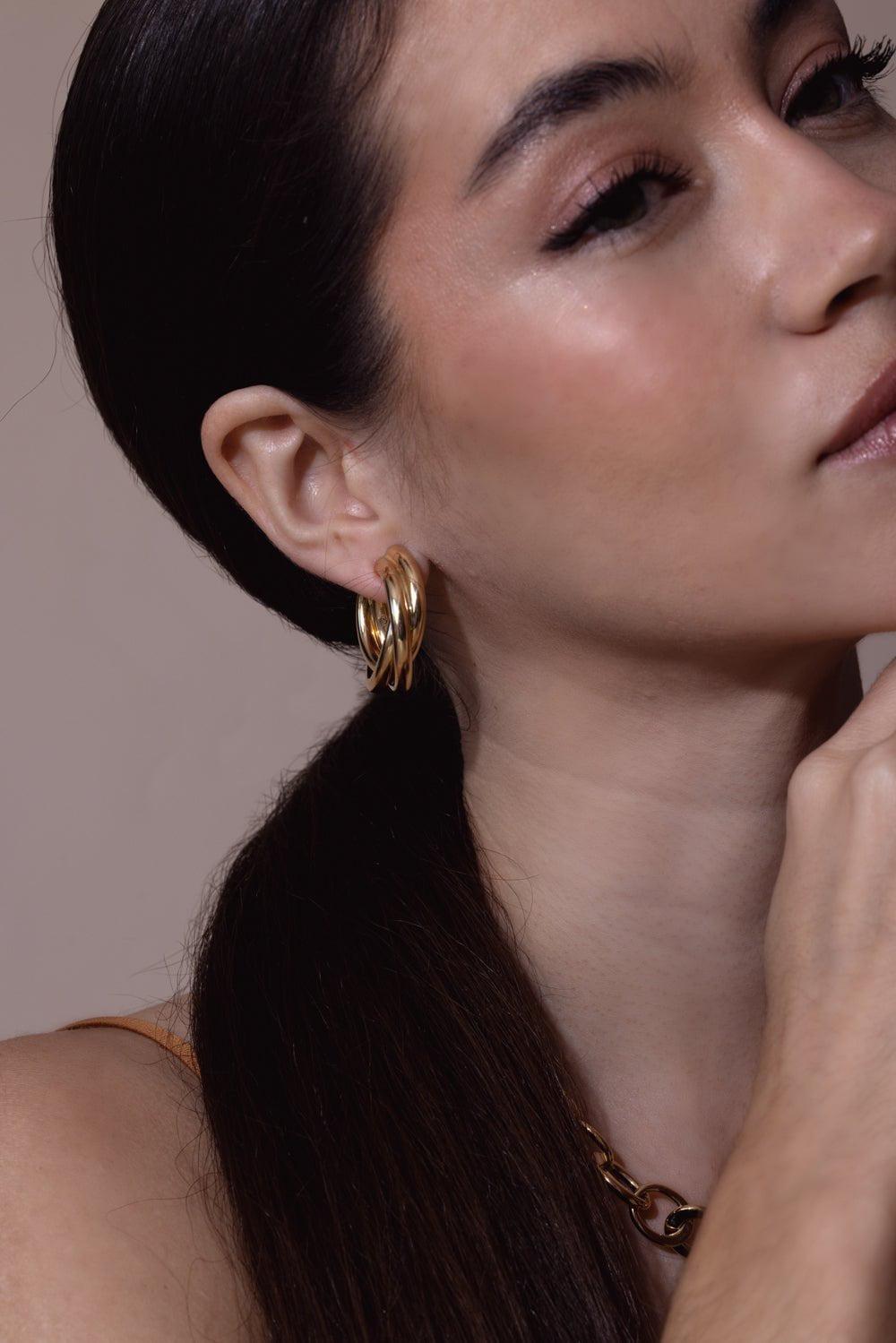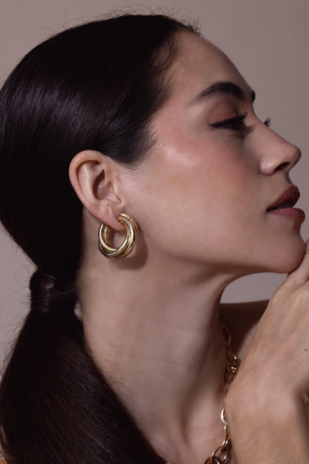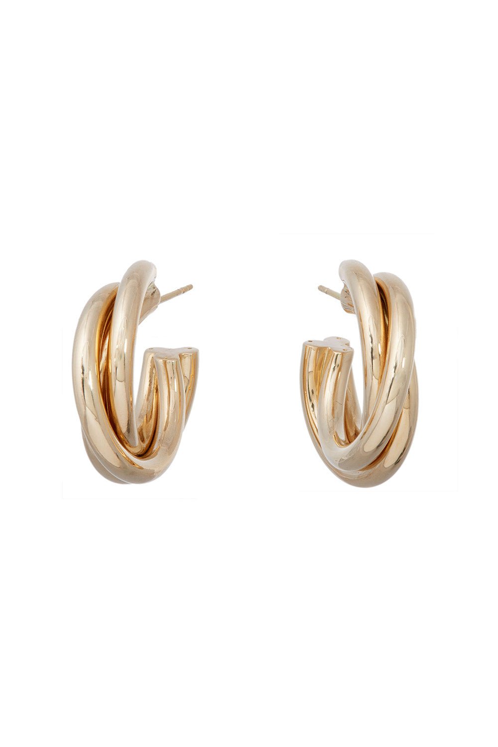 Sidney Garber triple intertwined hoop earrings in yellow gold.