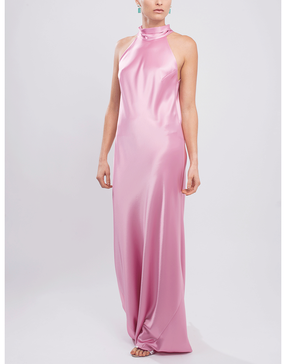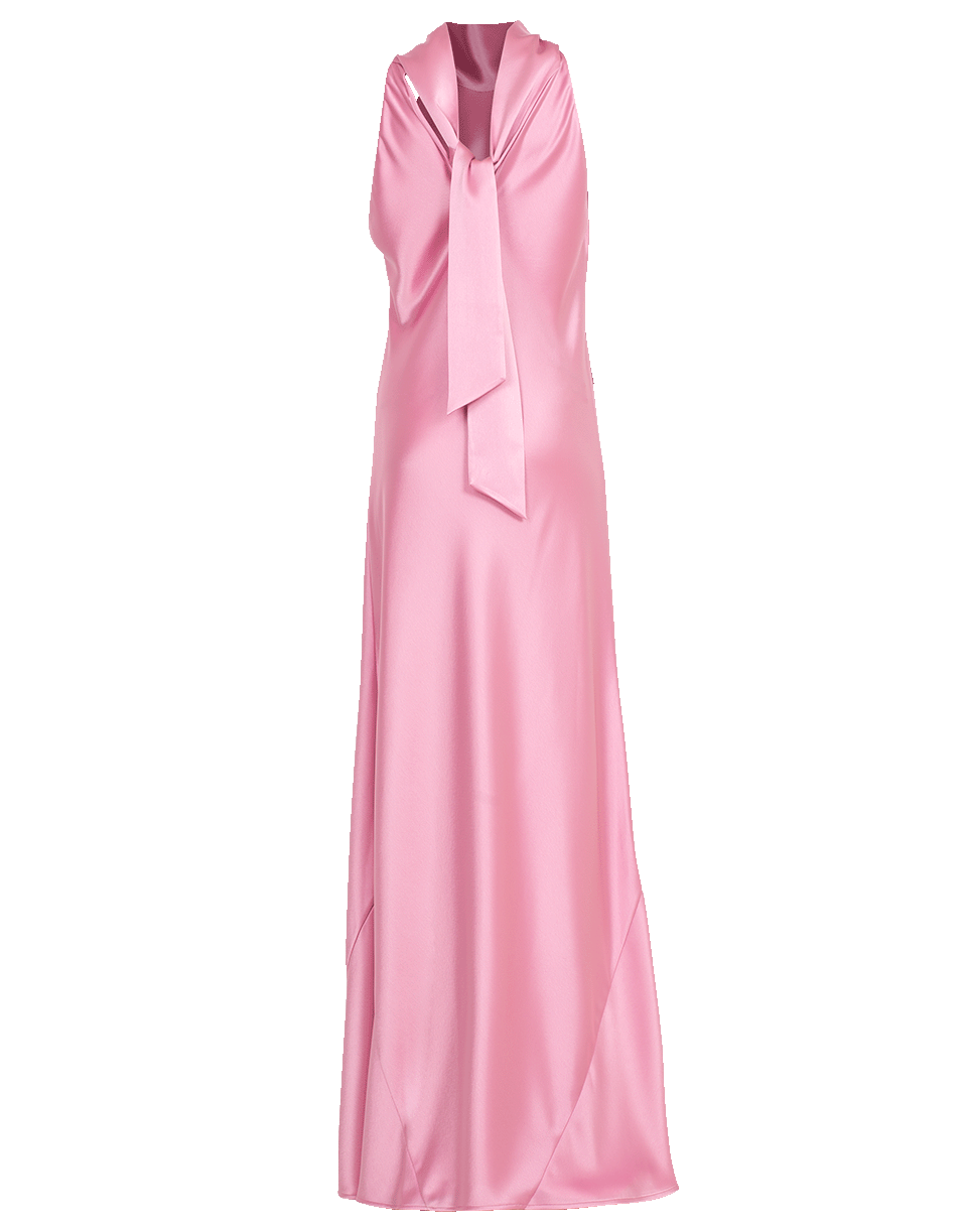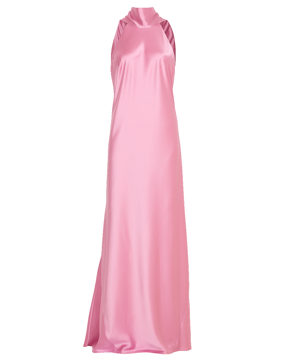Cut from heavy satin, this Galvan London gown features a slim fit with a sleeveless design, high neck, v-back, slipover style, and finished with a back sash.