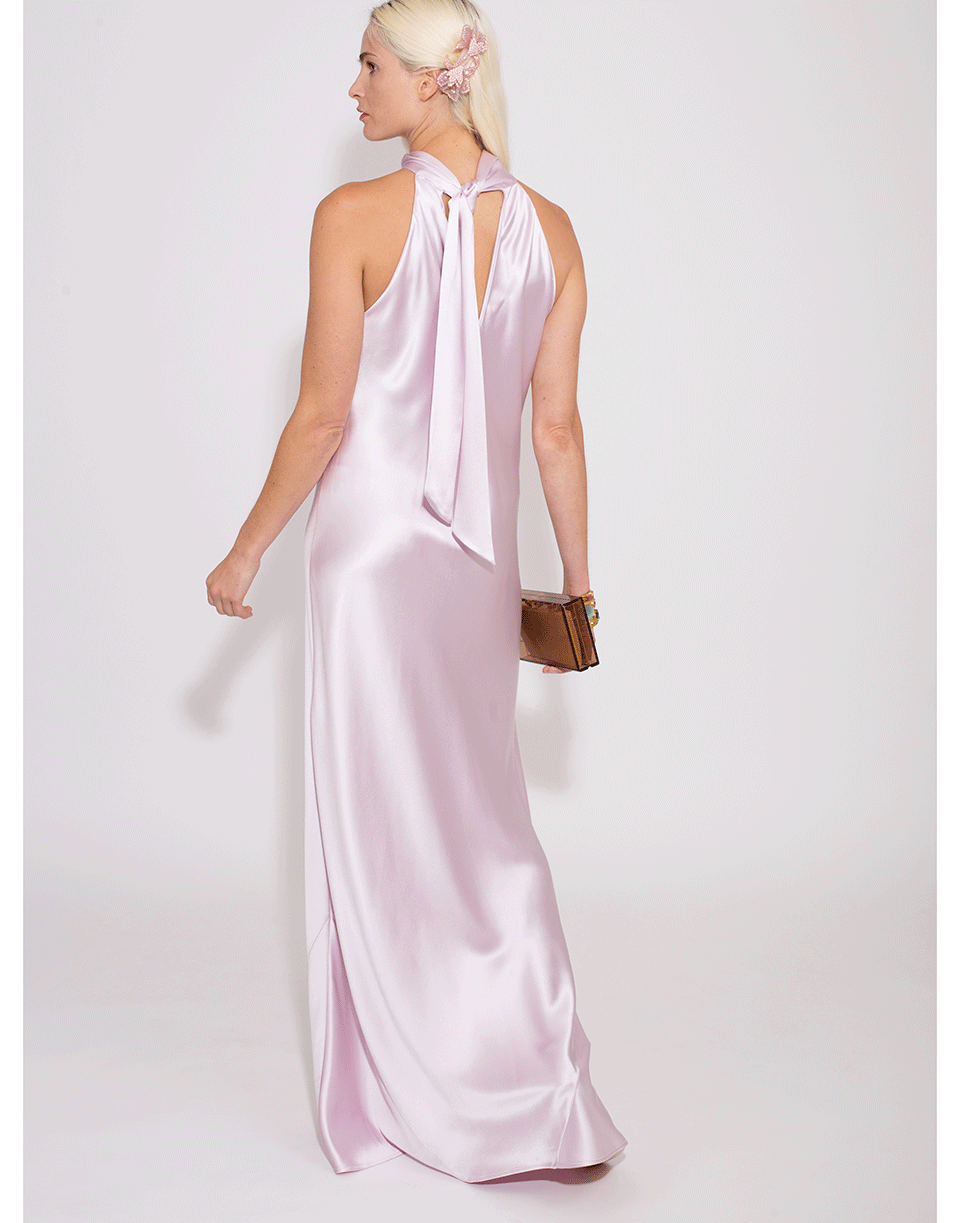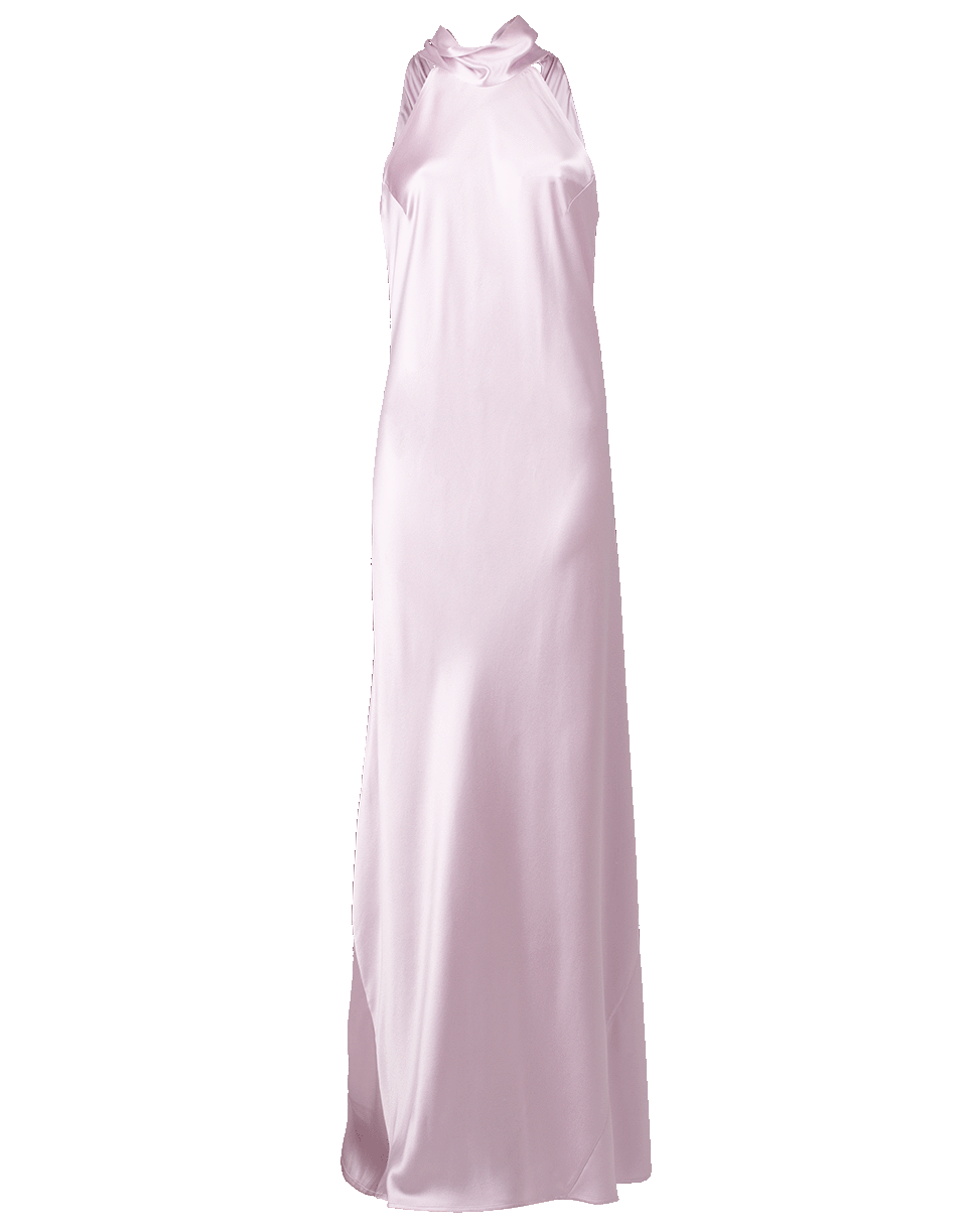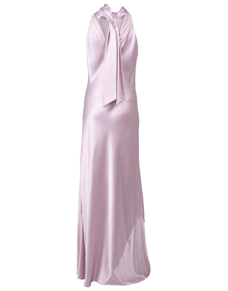 This satin slip dress from Galvan London is the ultimate flirt. It offers a flattering midi length silhouette with a sleeveless cut, halter necktie and a peek-a-boo cutout at back.