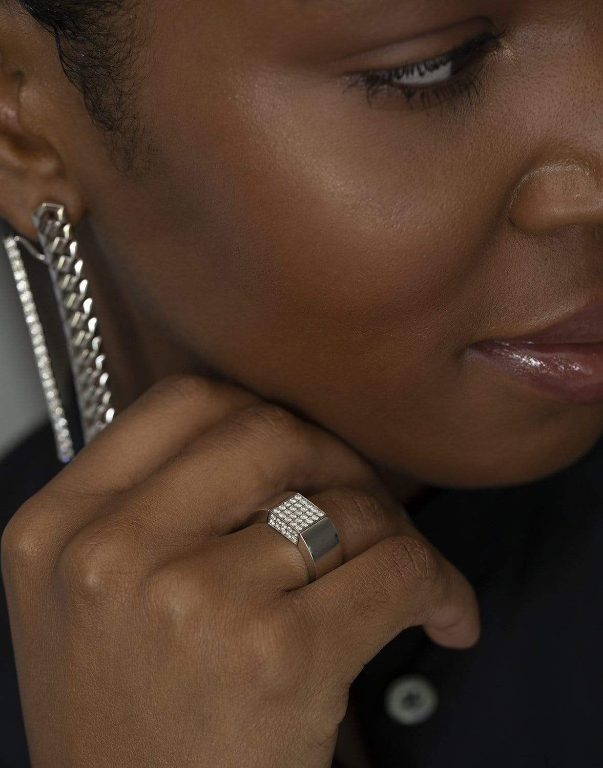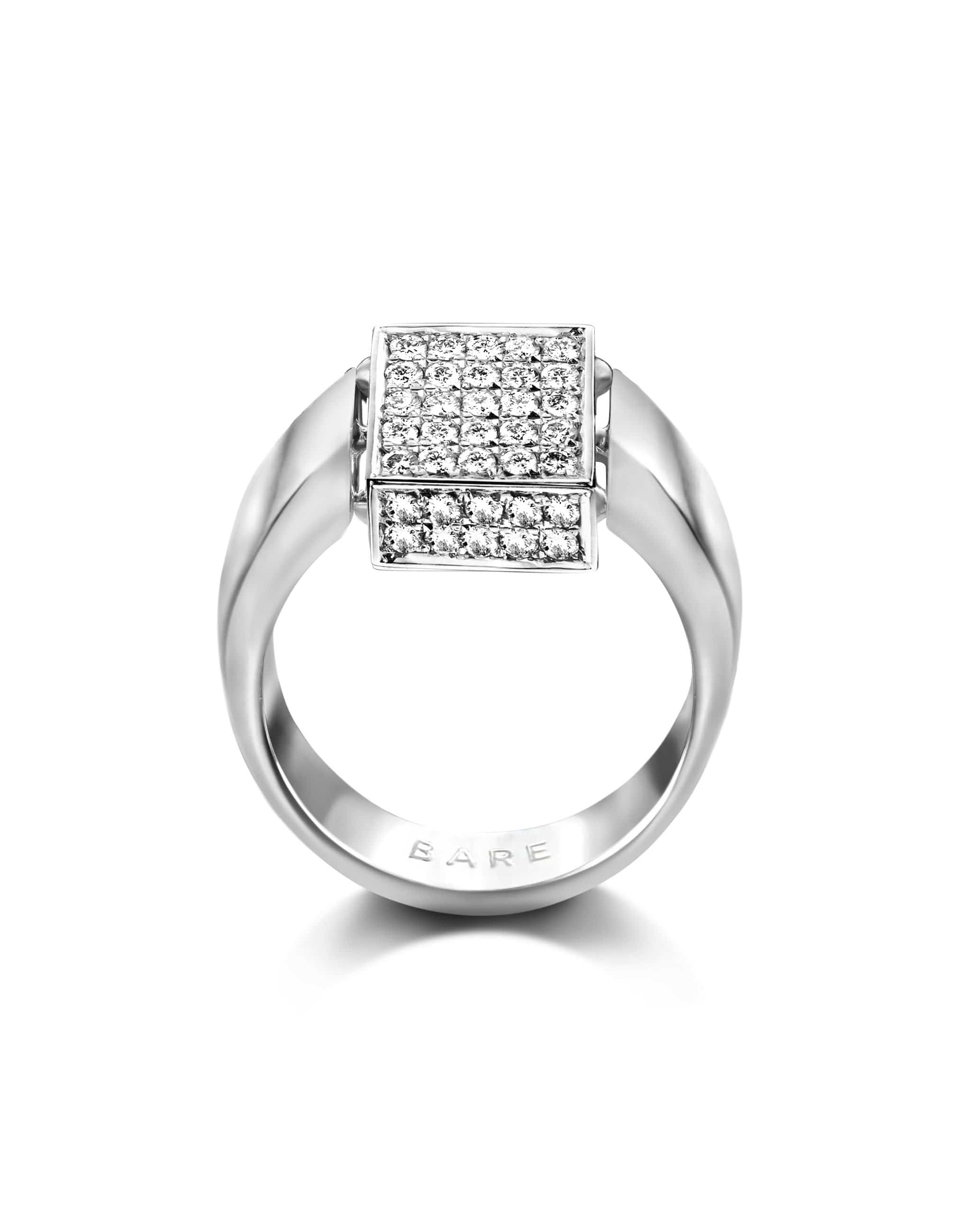 BARE Signet reversible diamond ring. This square signet-inspired ring is expertly crafted by hand from 18-karat gold, while the top of the central element is bedecked with an array of 0.7ct white diamonds.