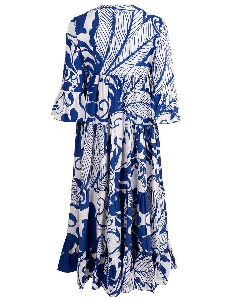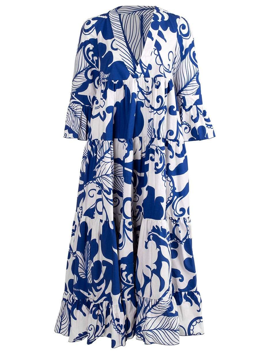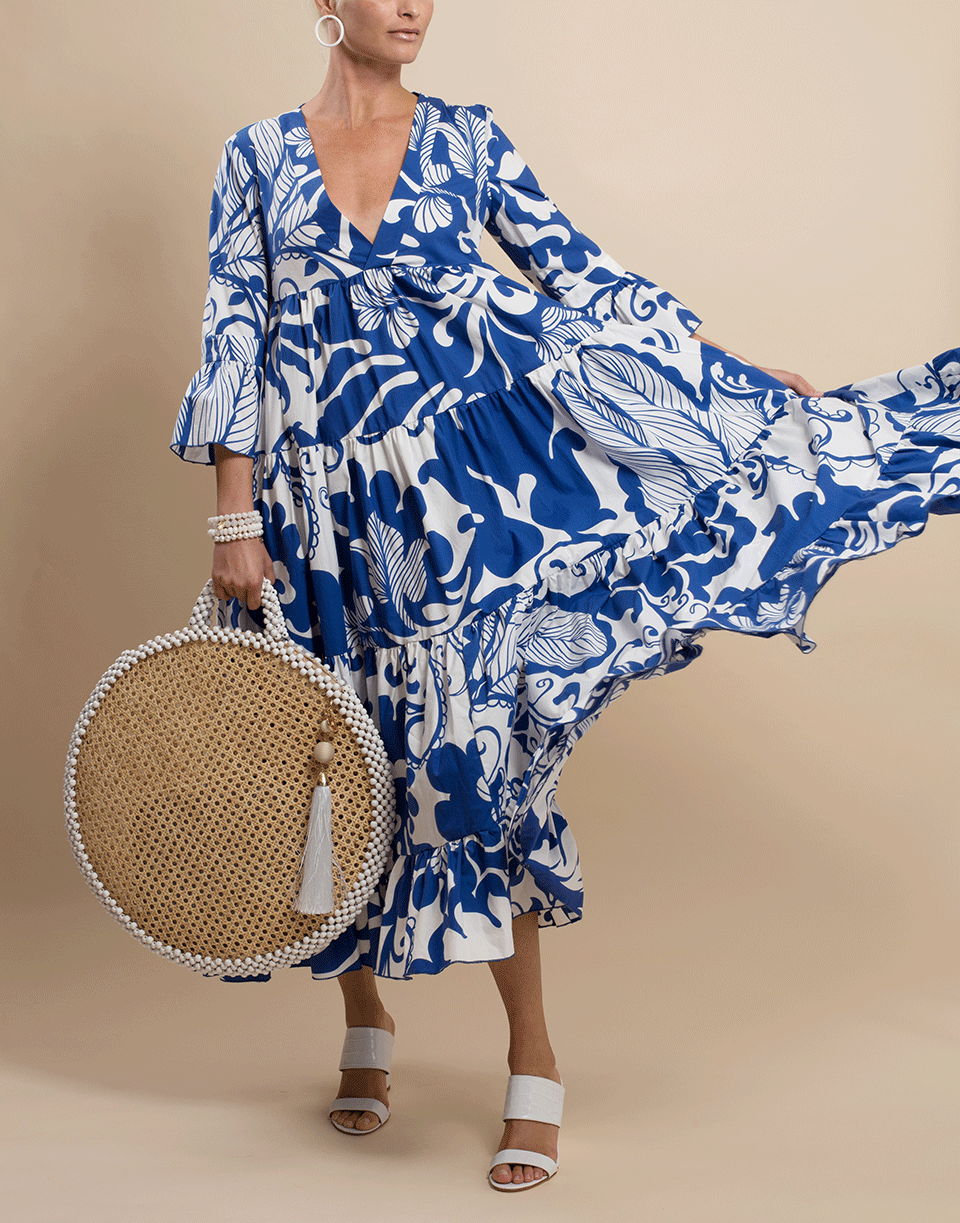 Slightly structured cotton poplin silk twill Jennifer Jane La DoubleJ dress is a cross between a caftan and a maxi dress. Fitted at the shoulders and bust, yet flouncy and columinous.