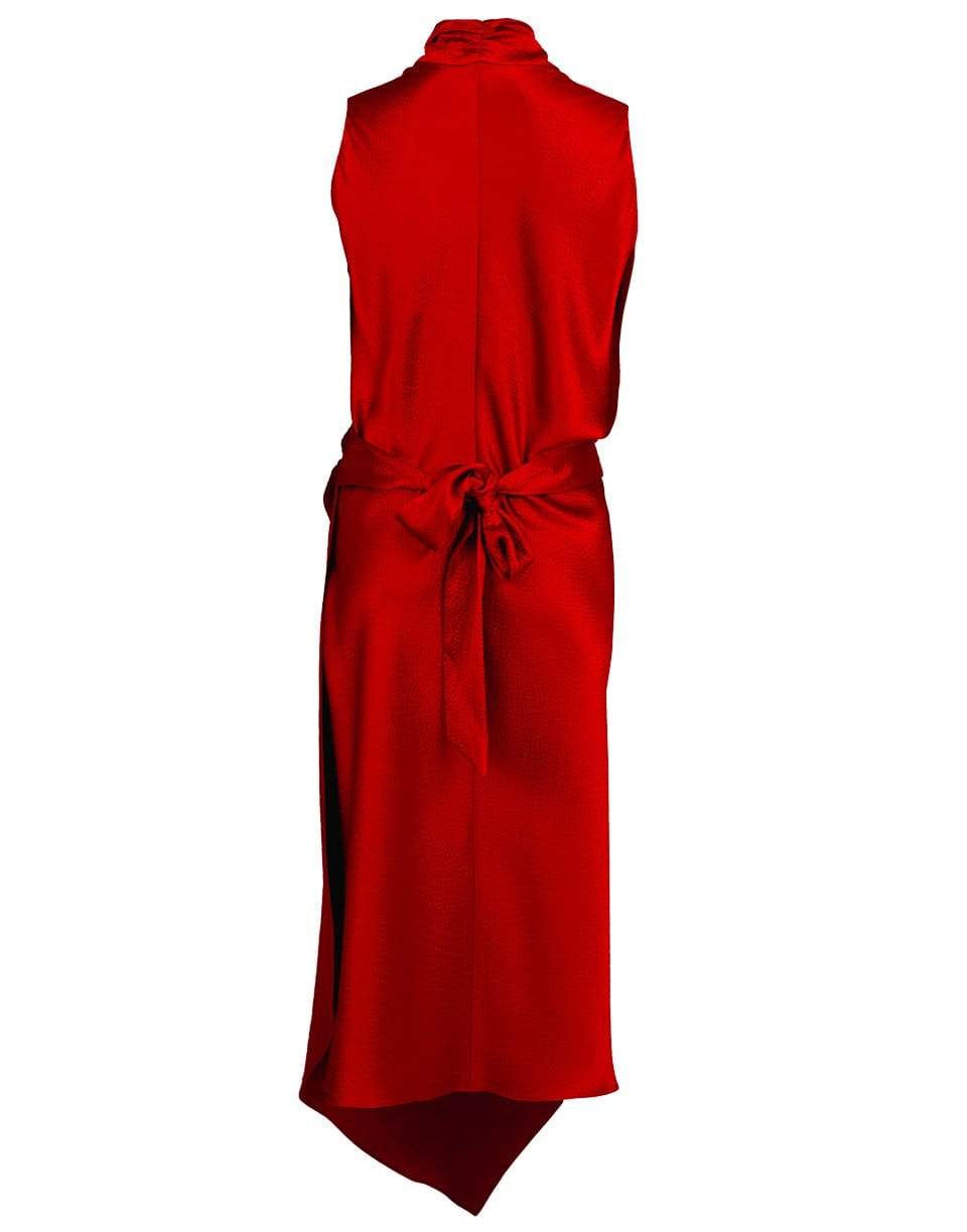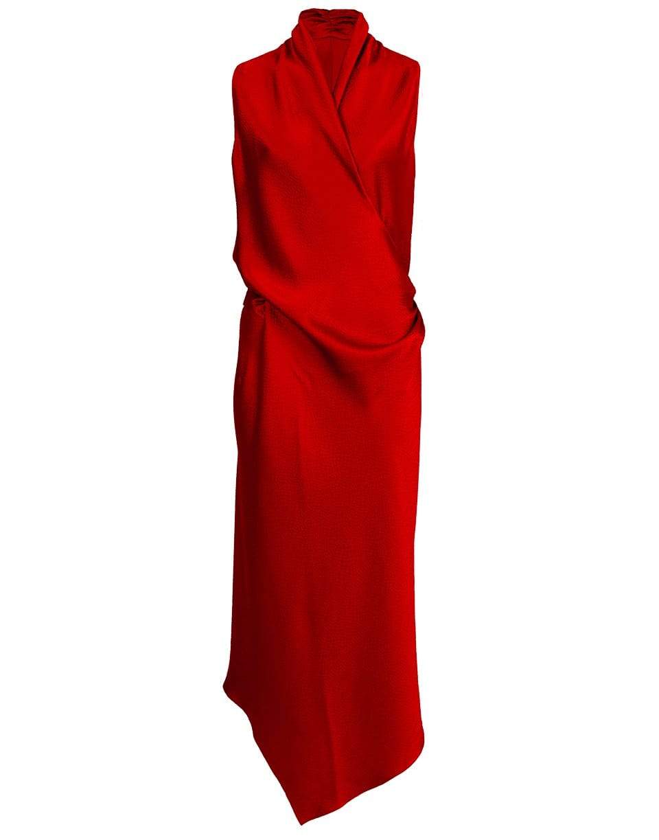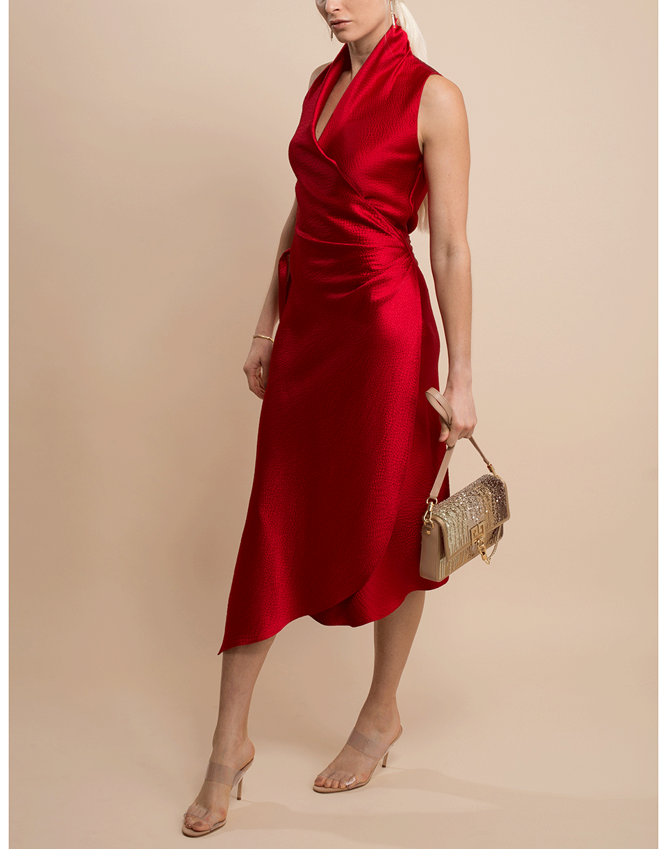 Sleeveless Victor dress from Peter Cohen featuring a wrap style with a v-neck, asymmetric hem, sleeveless design and a mid-length.