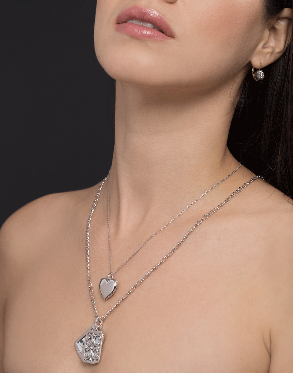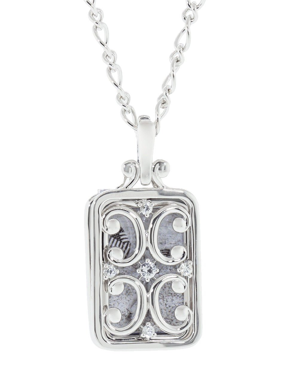 This 3-piece sterling silver and white sapphire locket set from Monica Rich Kosann features an iron gate style with a floral pattern peeking out from the back. Designed to fit 2/3 photos.