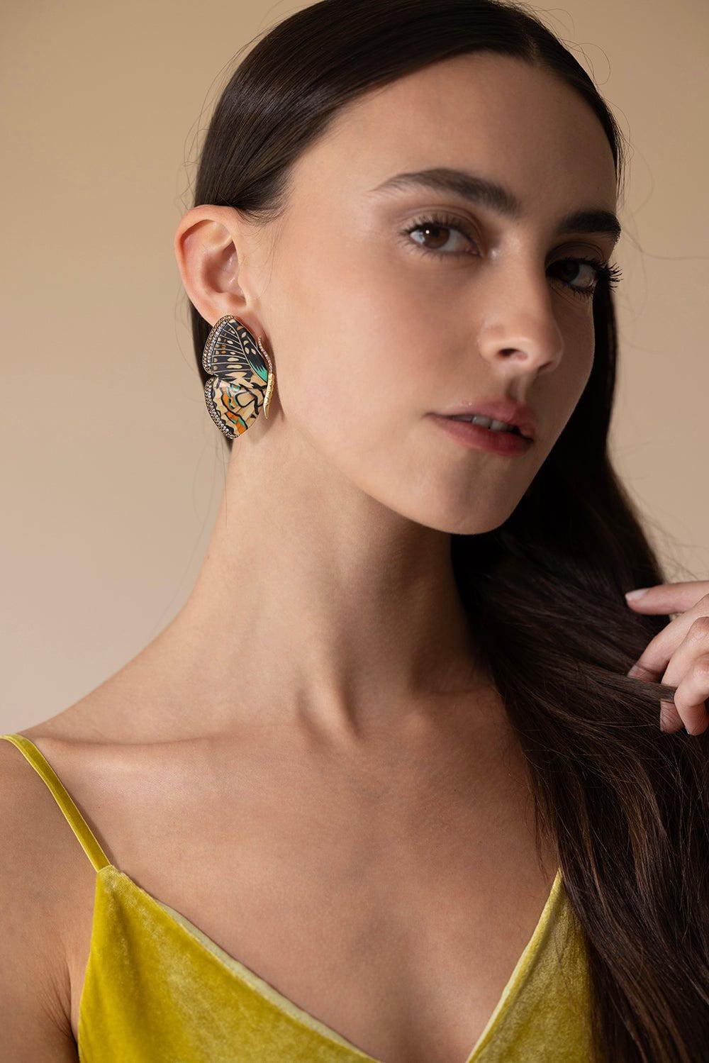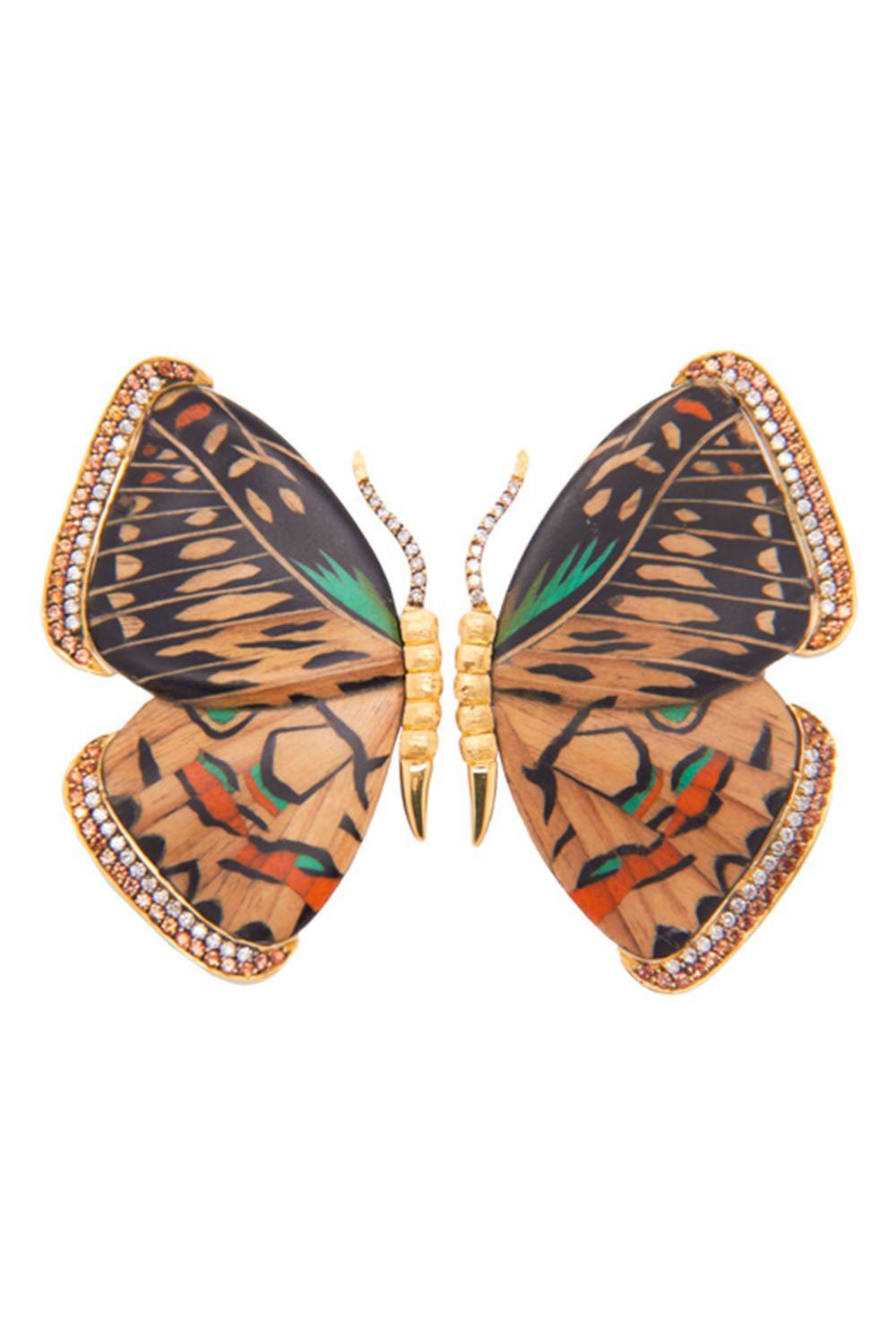 Silvia Furmanovich marquetry neutral butterfly earrings in yellow gold.