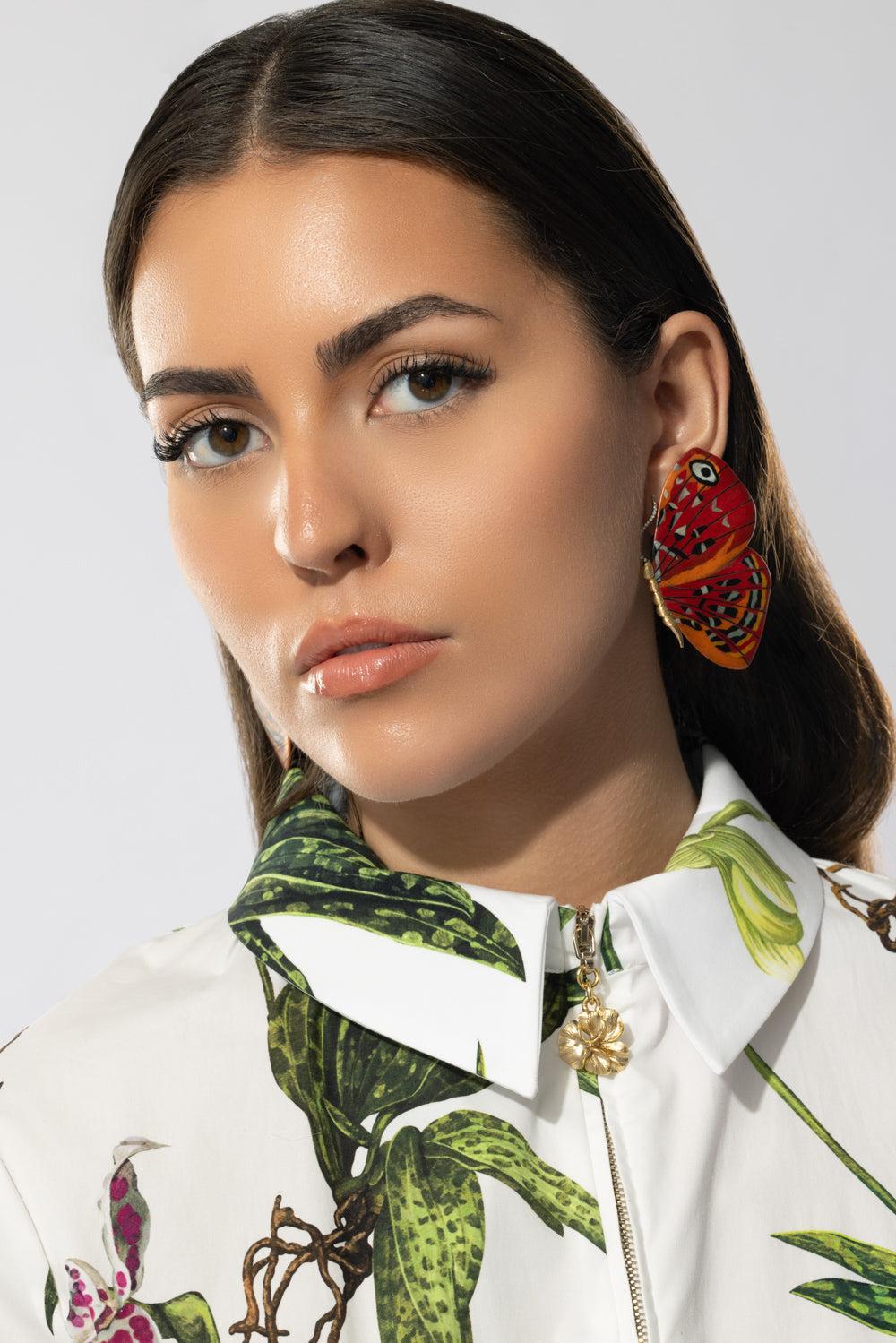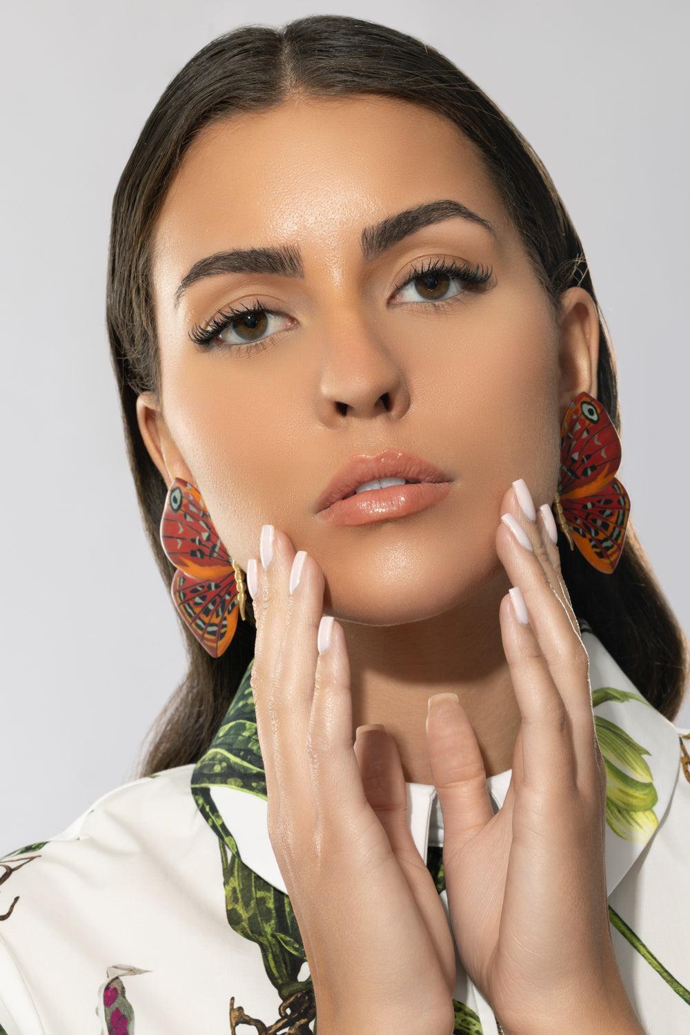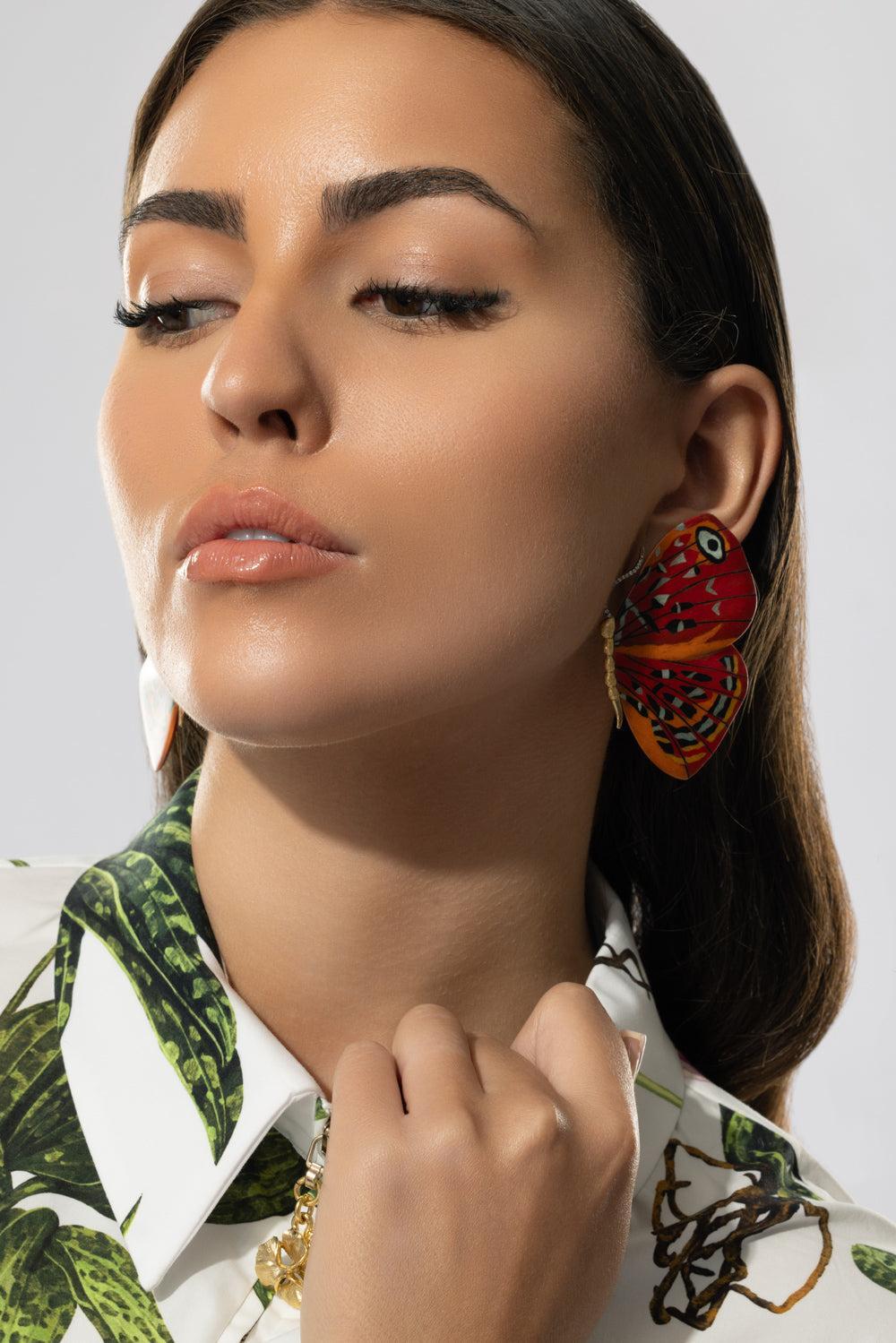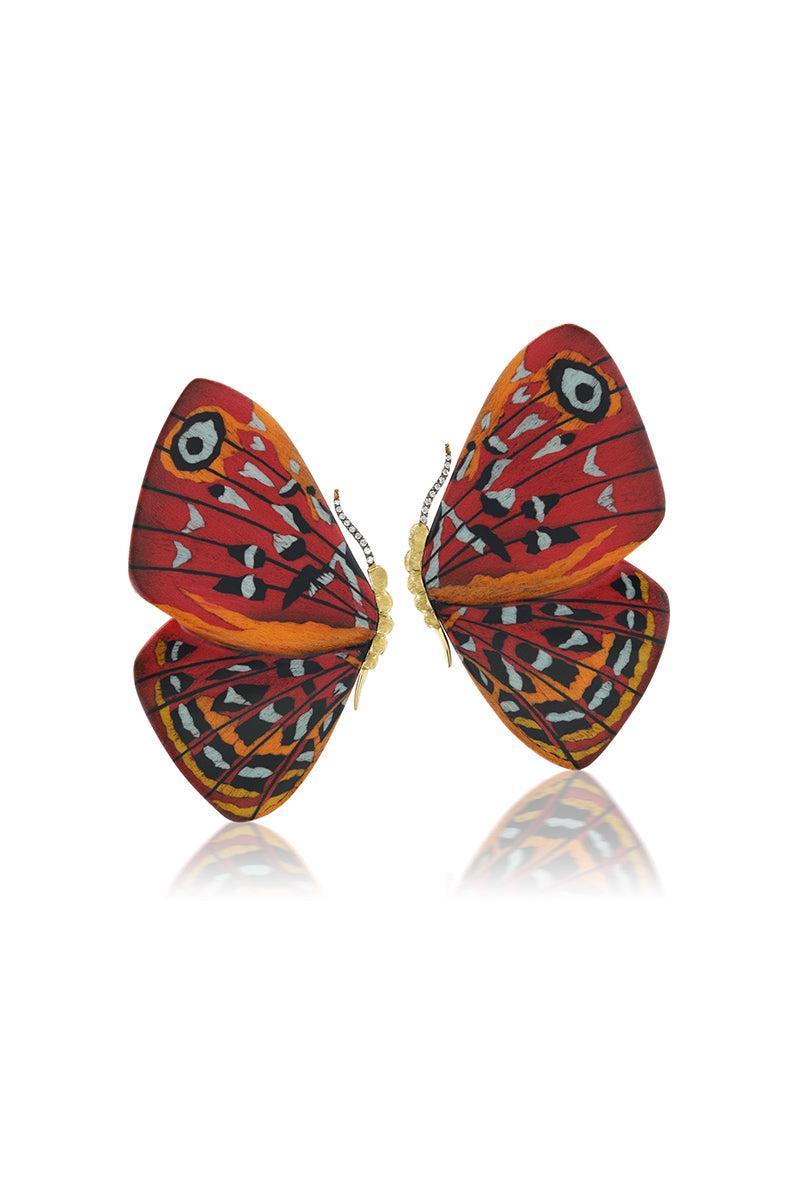 Silvia Furmanovich red orange marquetry butterfly earrings in yellow gold.