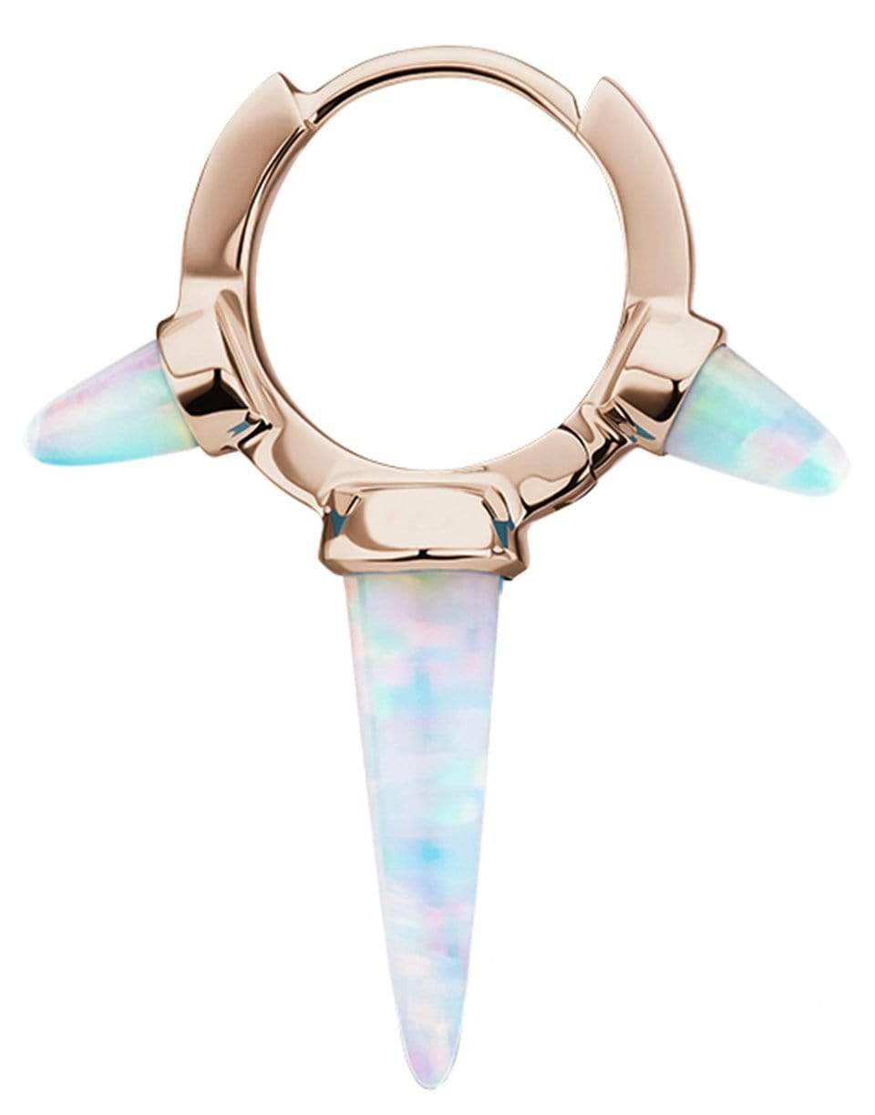 Maria Tash single clicker ring with a long opal spike flanked by two shorter spikes. For pierced ears.