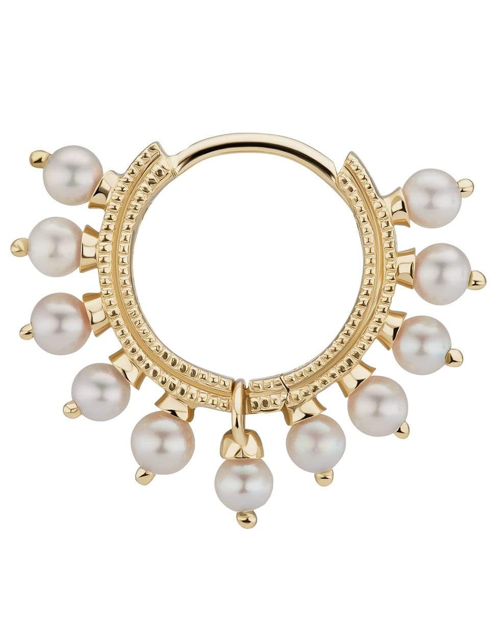 Maria Tash single pearl coronet ring with nine Akoya pearls. Eight of the pearls are set in a fixed position, while the bottom pearl dangles freely.