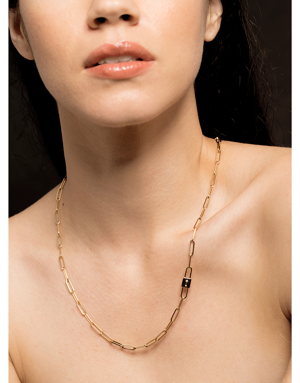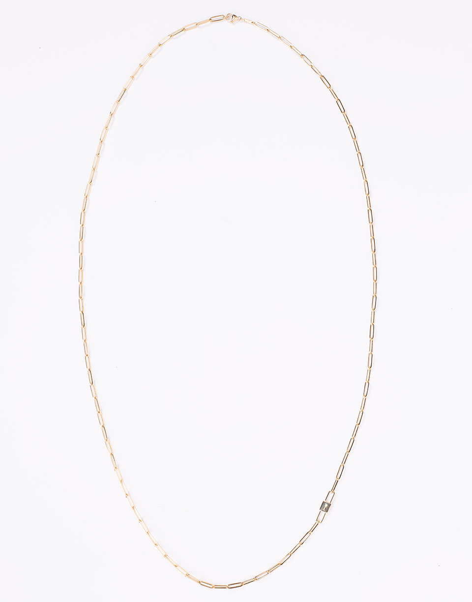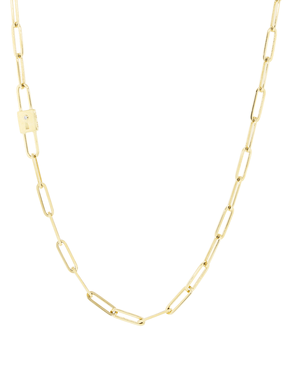 This 18k yellow gold single strand paperclip chain necklace has an accent lock charm with a diamond in the keyhole. It can be worn on its own or layered with multiple necklaces.