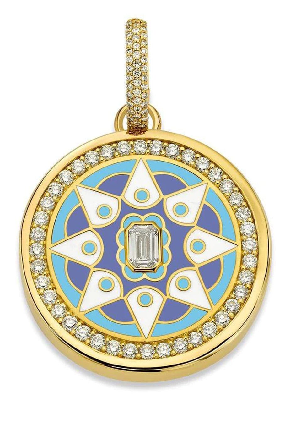 Buddha Mama sky blue mandala rock crystal pendant set with diamond baguette at center and diamond enhancer.