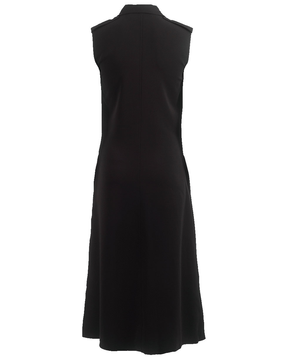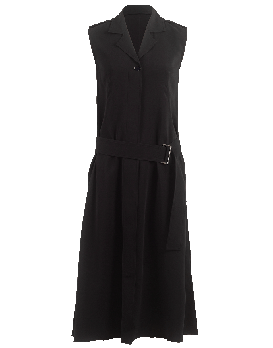 Black belted midi dress from Victoria Beckham featuring a sleeveless cut, spread collar, single button and zip closure at front, pleated skirt and finished with a waist belt.