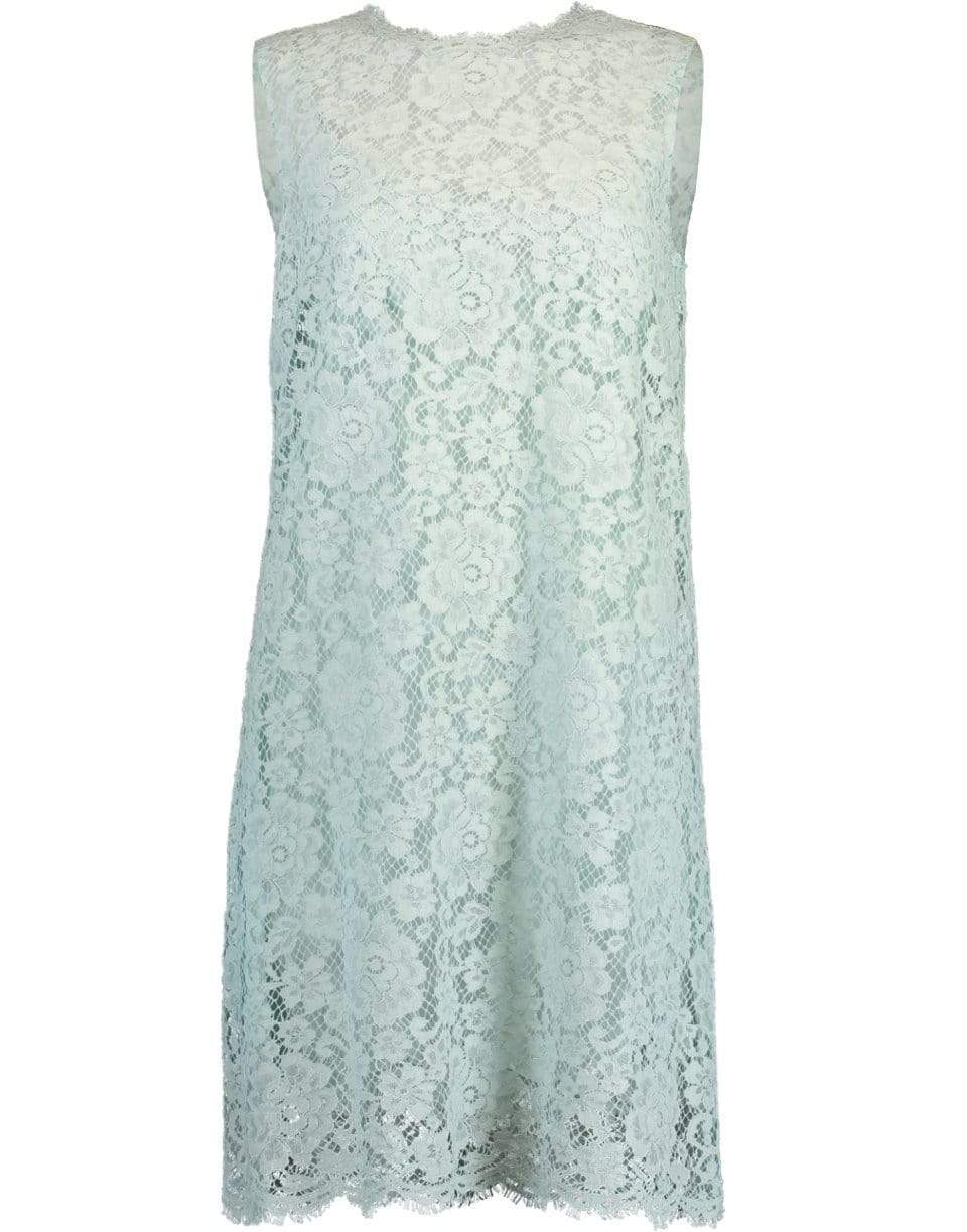 Choose sophisticated elegance for your special occasions. Coming in the iconic cordonetto lace, this short dusty ice blue dress will charm you with its understated shape. Round-neck with scallop detailing, silk crepe de chine slip with lace trims, and rear zipper and hook-and-eye fastening.