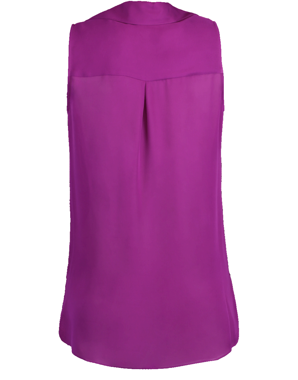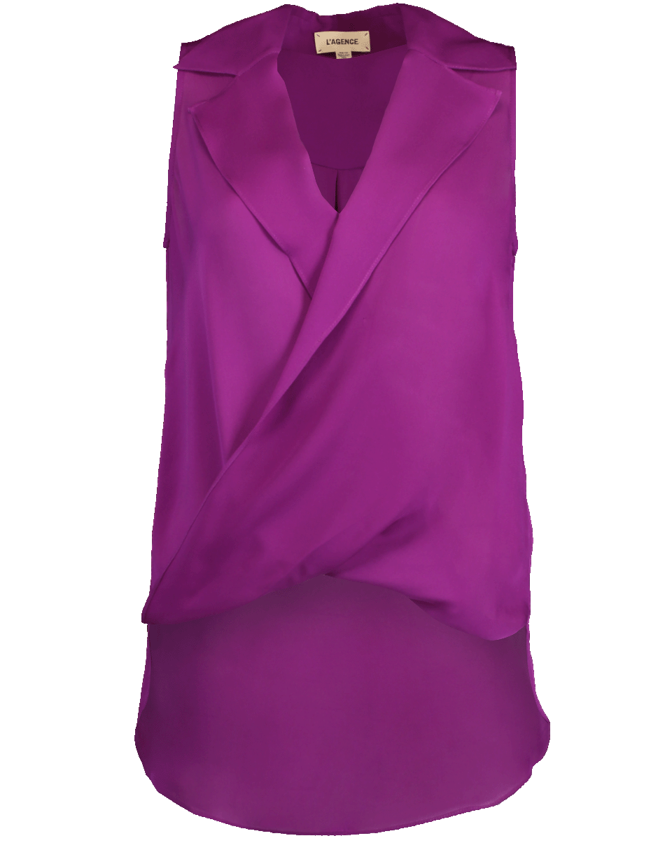 Cut from lightweight silk, this sleeveless blouse by L’Agence features a notched collar, a wrap style front, shirttail hem and back yoke inverted box pleat.