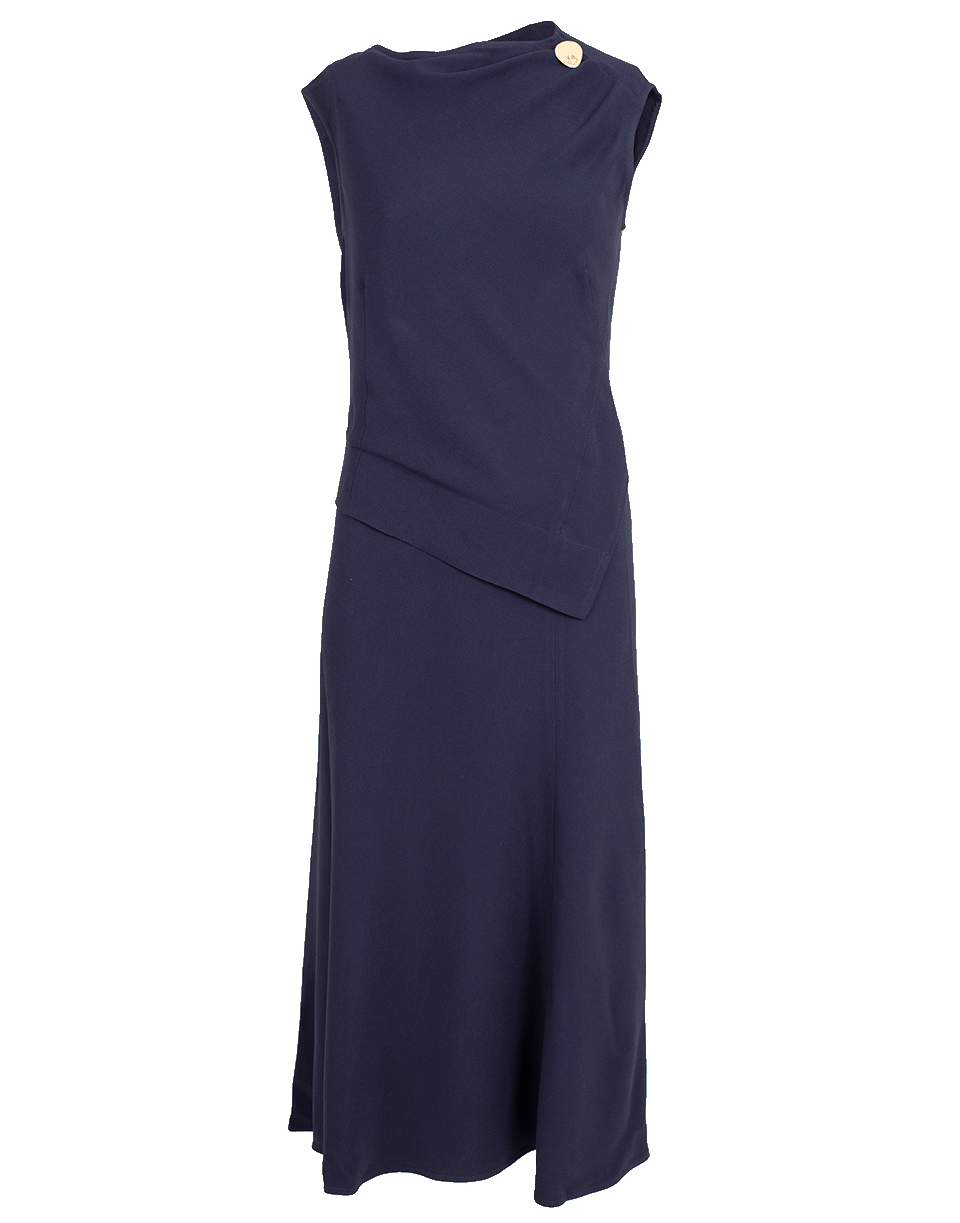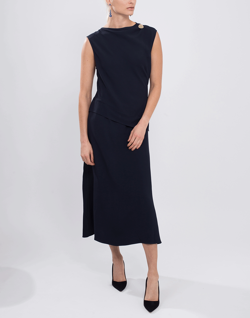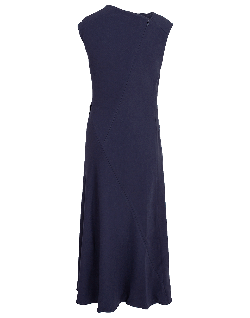 Navy midi dress from Victoria Beckham featuring a slim fit, sleeveless cut, cowl neckline, draped front, a detachable gold-tone brooch, concealed back zip, and a mid-length.