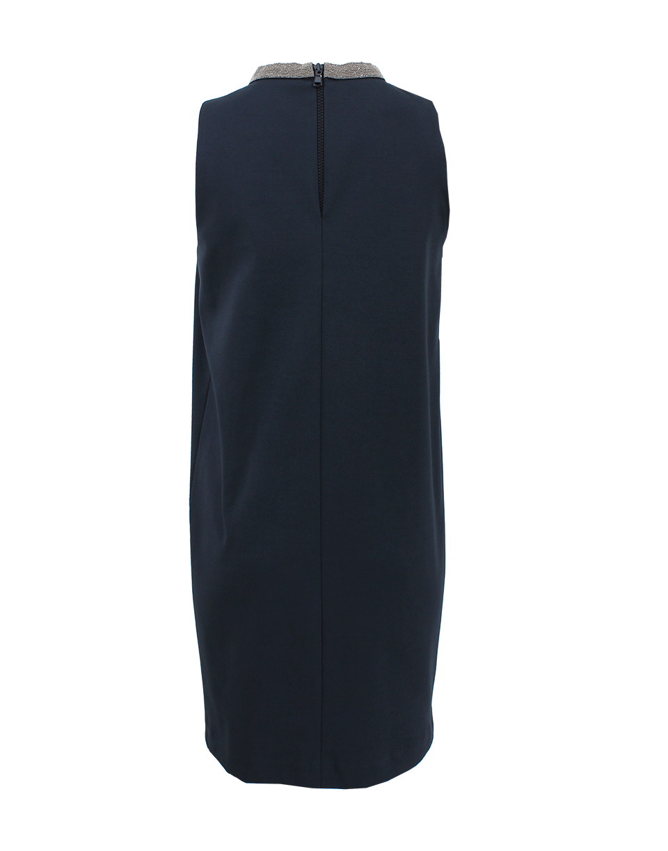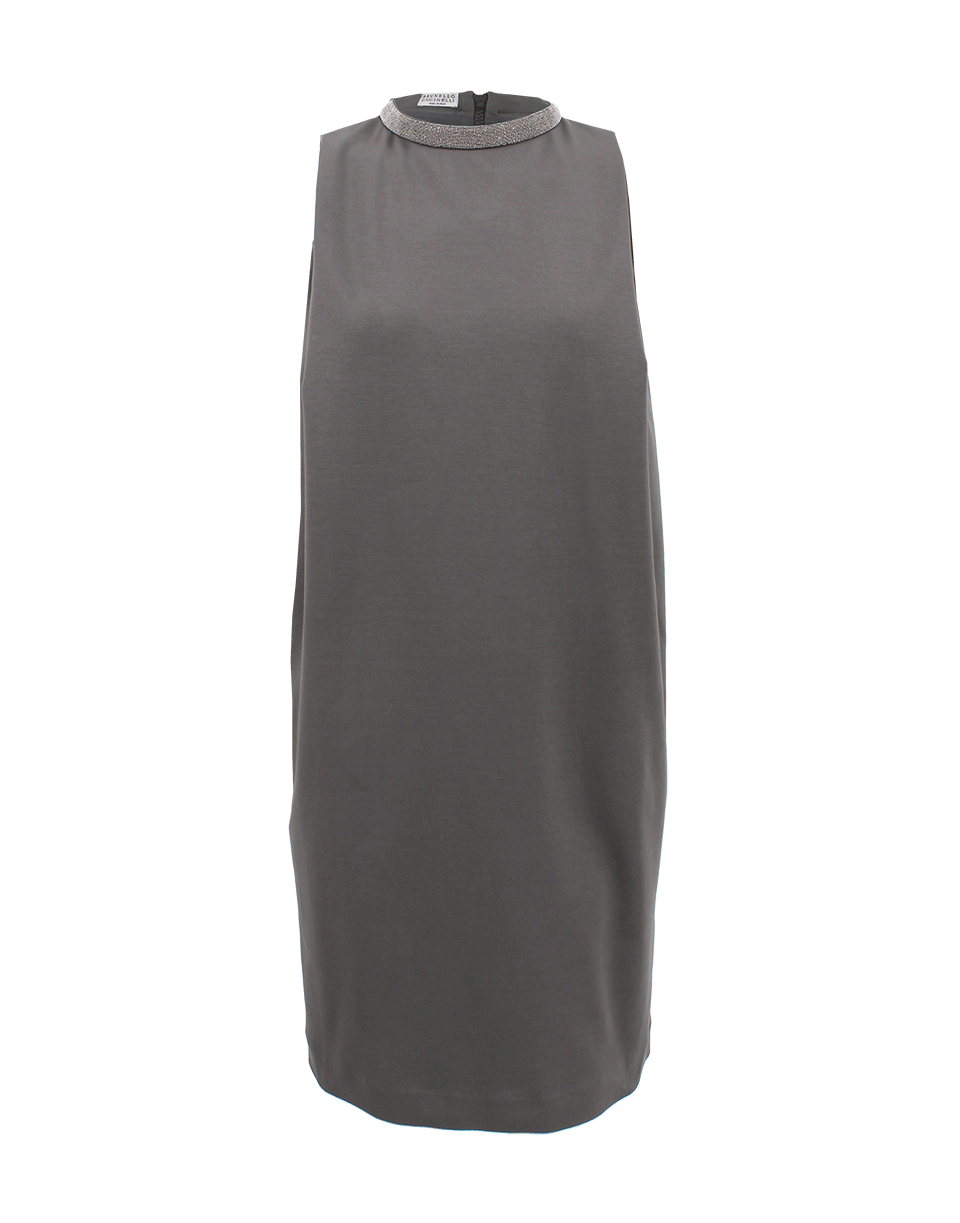 Combining casual comfort with cocktail elegance, Brunello Cucinelli's sleeveless jersey monili collar dress is a must-have. Pair with sparkling sandals and embellished clutch for an evening to remember.
