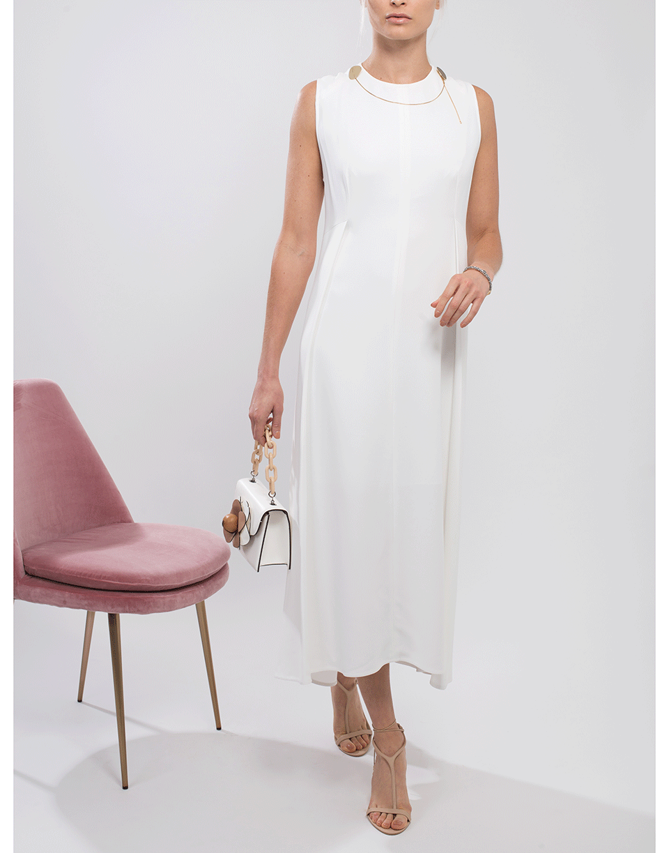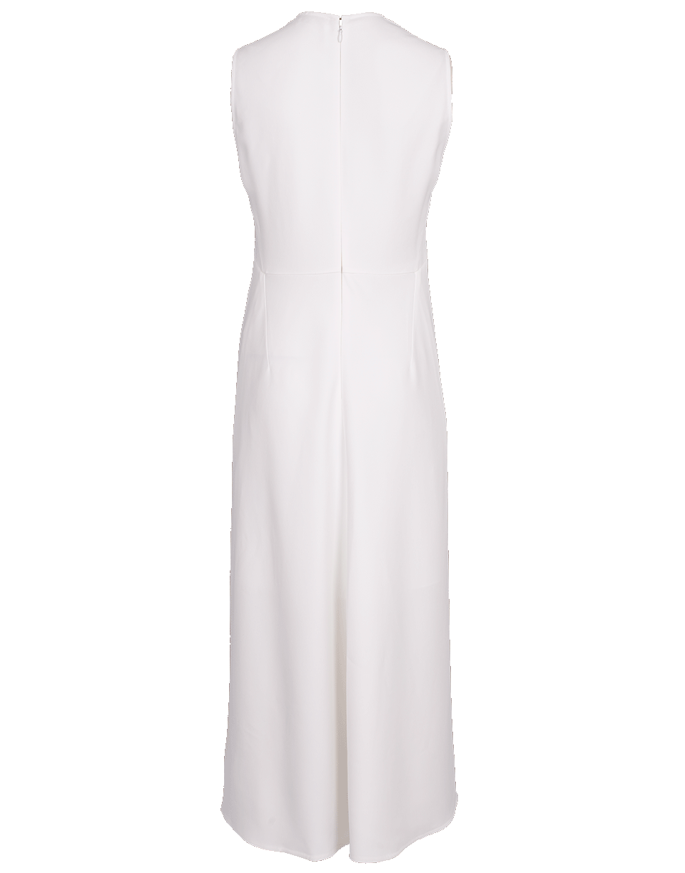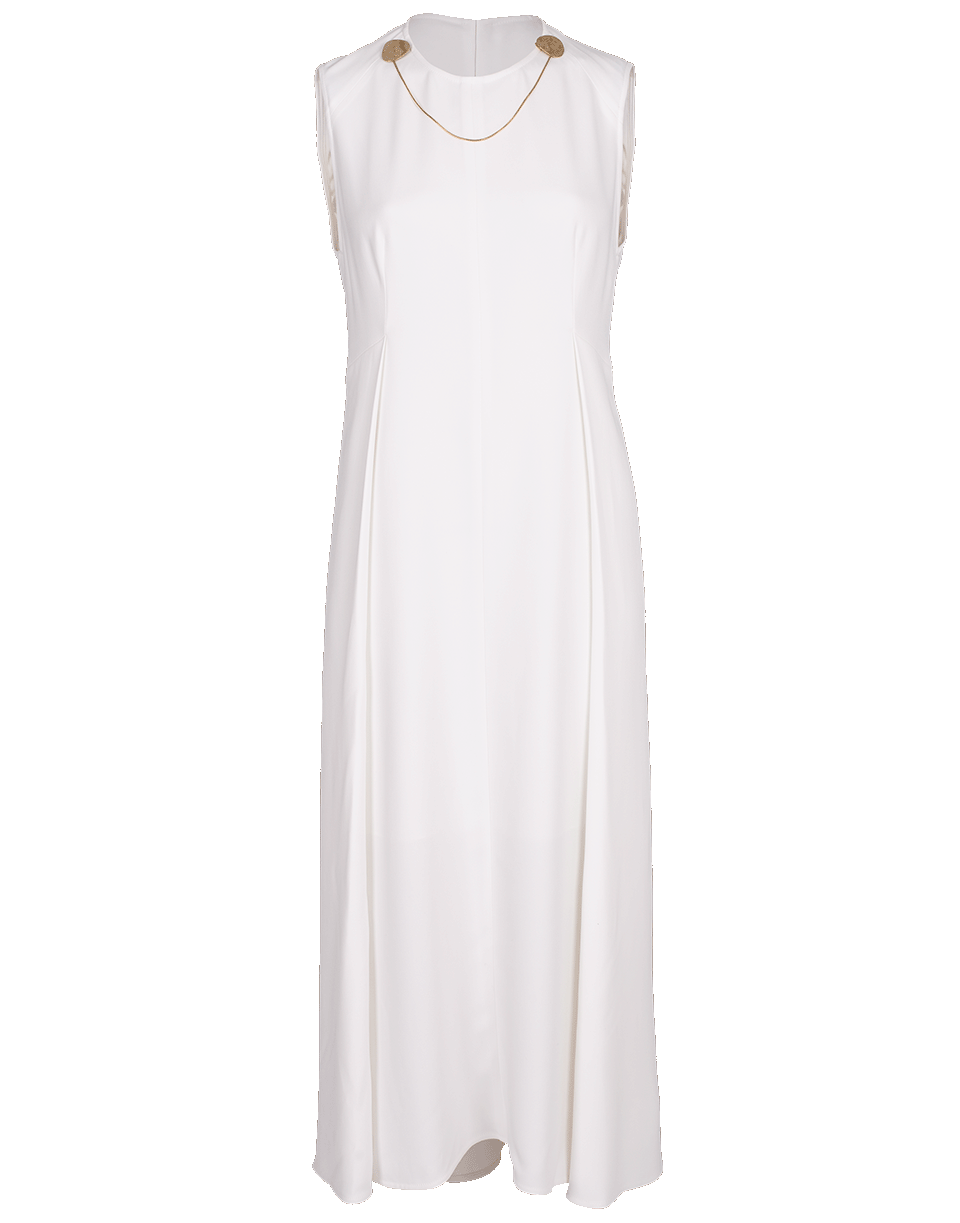 Ivory midi dress from Victoria Beckham featuring a fitted bodice, sleeveless cut, round neckline, front pleats, a detachable gold-tone brooch, concealed back zip, and a mid-length.