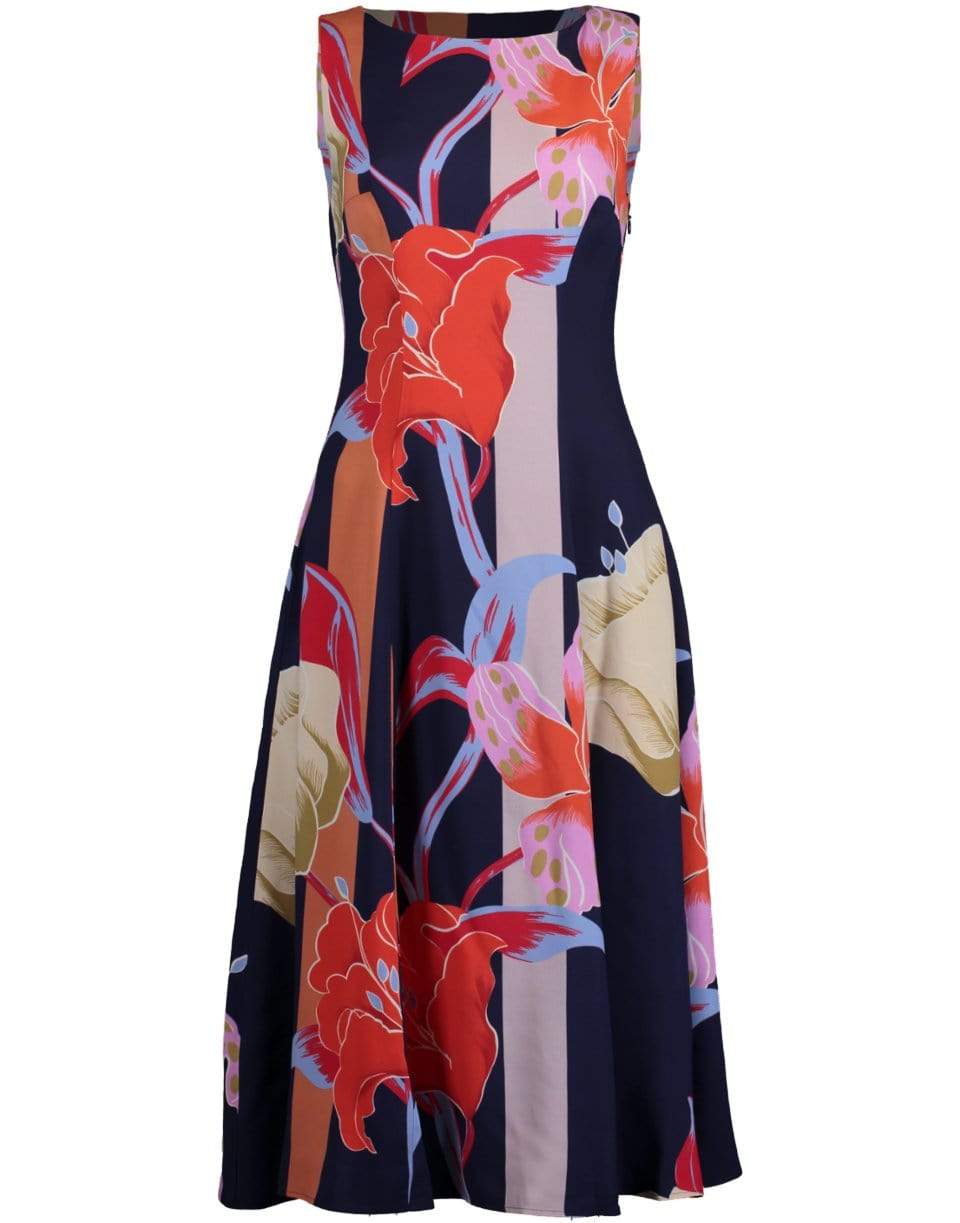 Etro sleeveless printed flounce dress with boatneck, fitted waist, side pockets, concealed zip closure, and a mid-length.