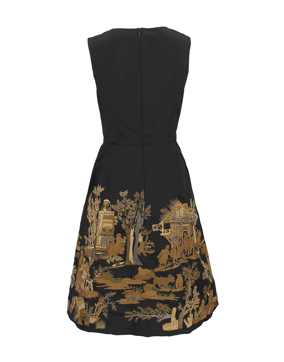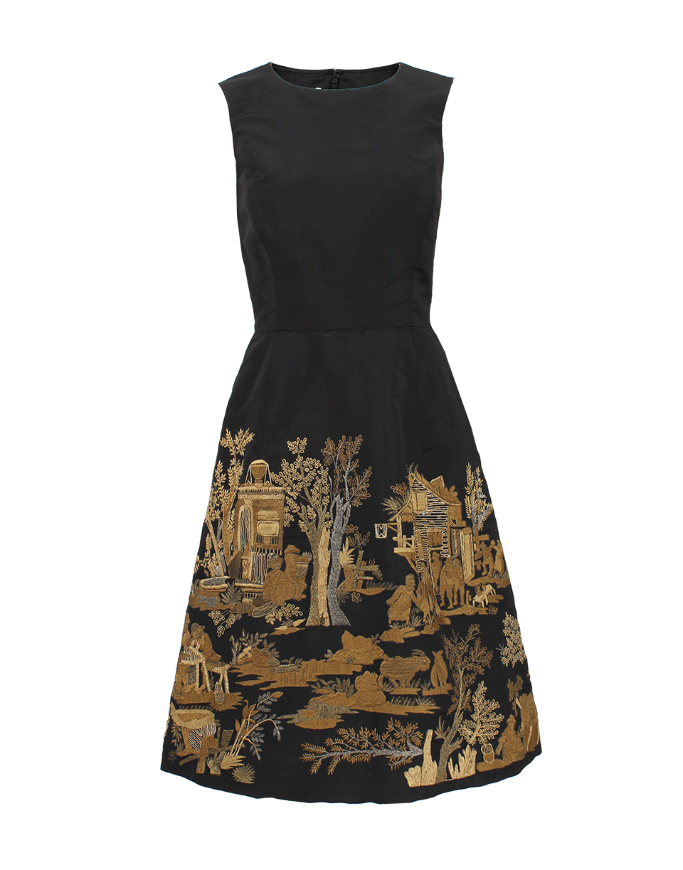 Like a gorgeous canvas of a golden masterpiece, Oscar de la Renta's sleeveless scenic embroidered dress is exquisite. Dress it down with ballet flats and python tote for a day of lunching and shopping.