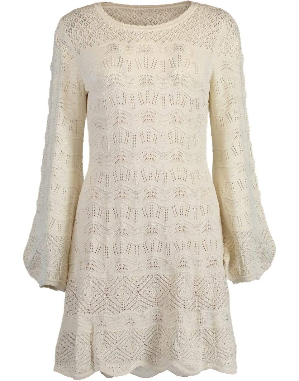 Fully-lined Twinset knit slim dress with long sleeves, round neck, slipover style, and a short length.