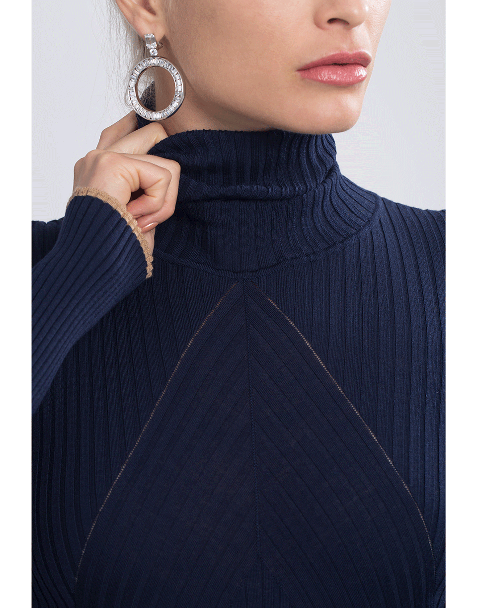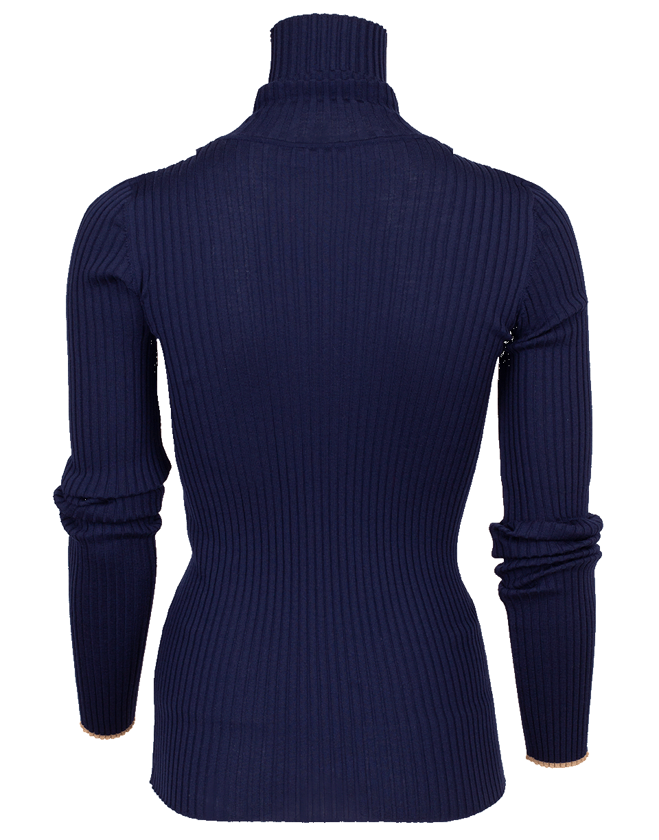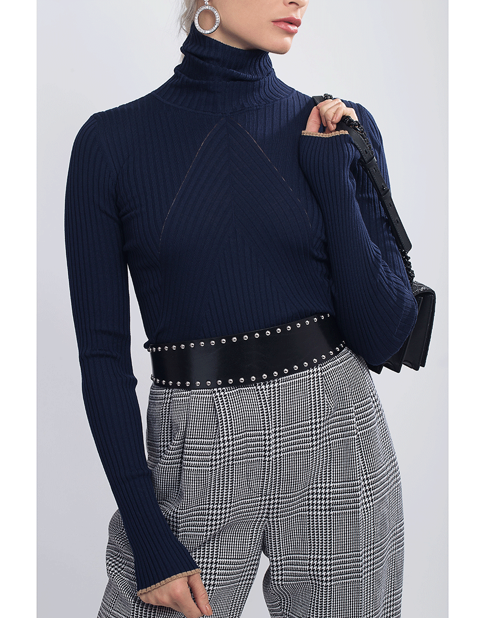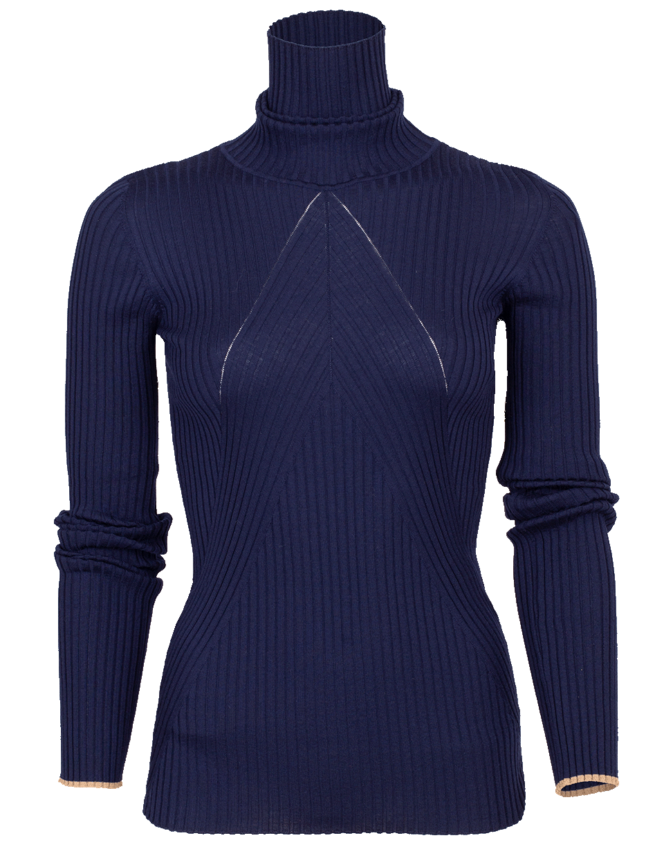 Victoria Beckham's merino wool knit sweater is designed for a slim fit. It features a turtle neckline, long sleeves with contrasting trim, and a chevron rib print.
