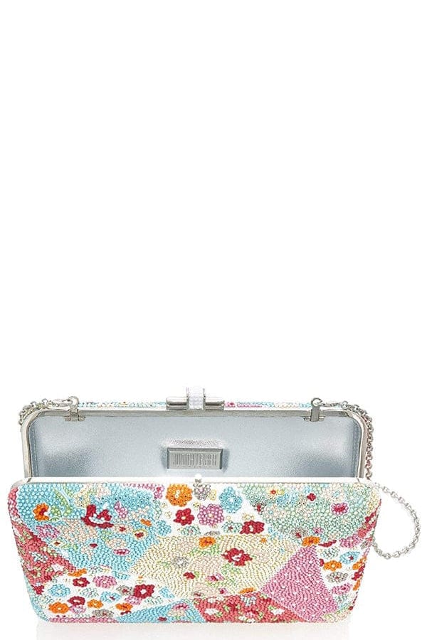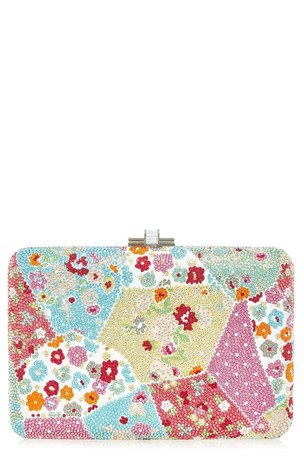 Judith Leiber slim Slide Patchwork Clutch in silver multi.