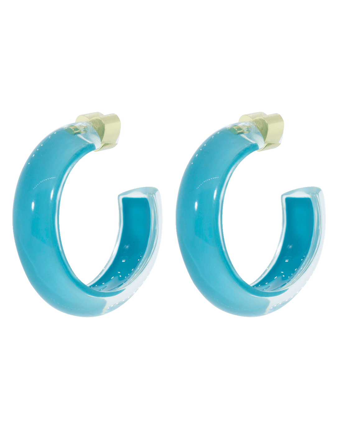 These small Alison Lou 'Loucite' hoops are hand-painted with teal enamel, covered in clear Lucite, and finished with brass plated 14k yellow gold backs and heart shaped posts.