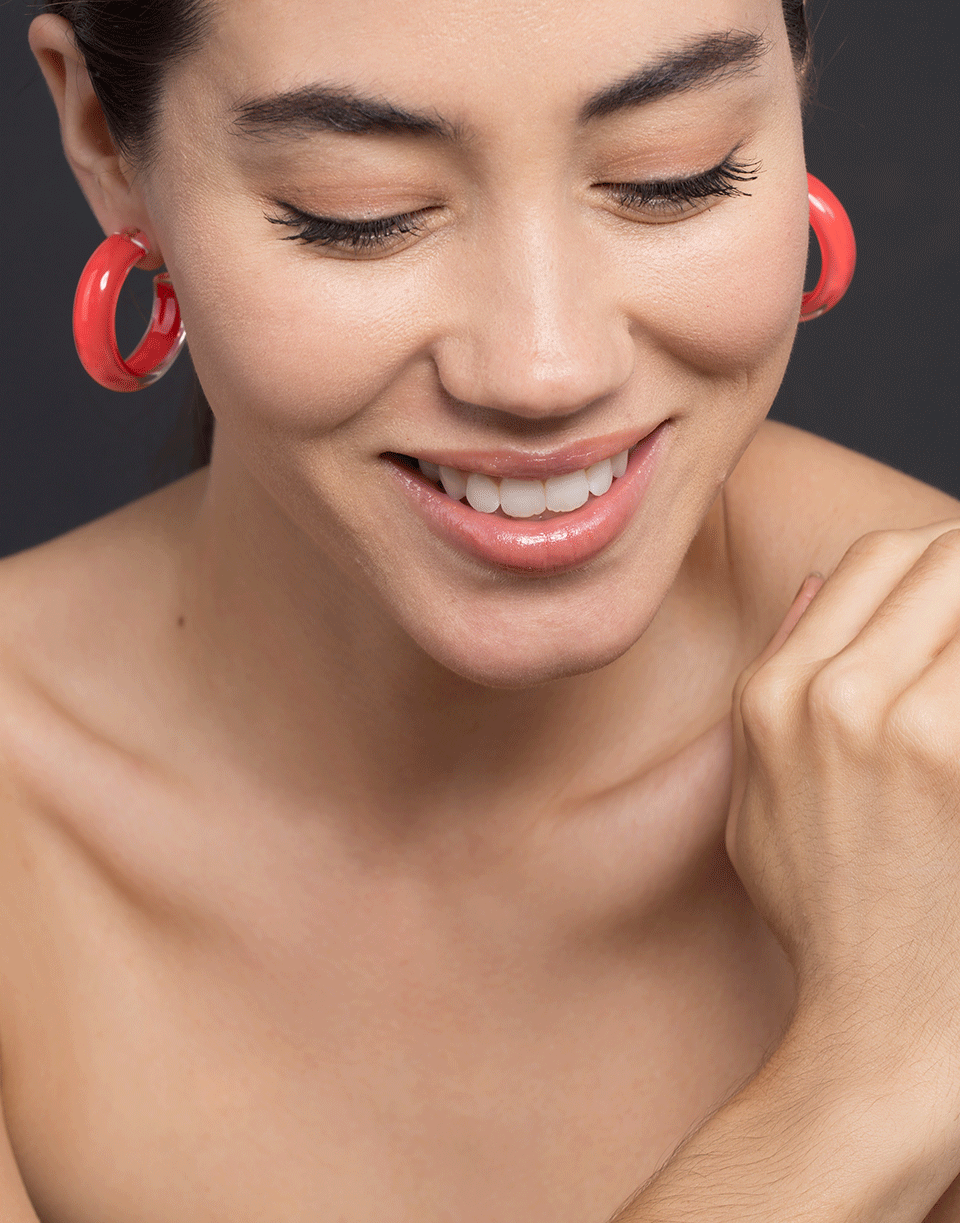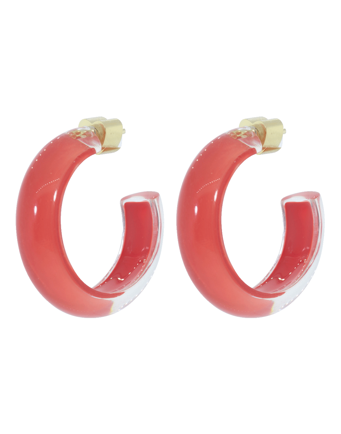 These small Alison Lou 'Loucite' hoops are hand-painted with coral enamel, covered in clear Lucite, and finished with brass plated 14k yellow gold backs and heart shaped posts.