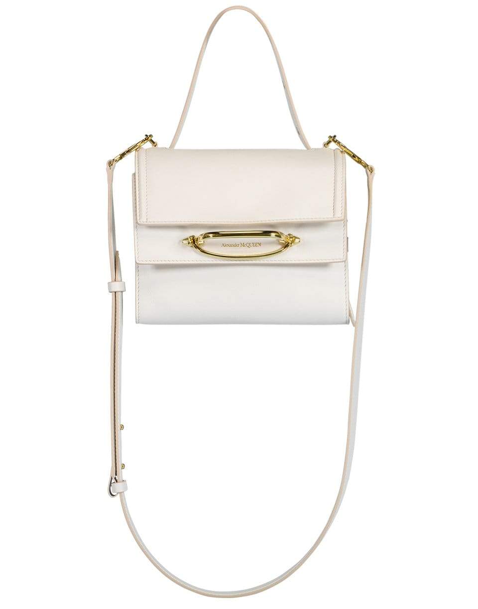 Smooth calf leather Alexander McQueen double flap shoulder bag with a specious main compartment, fixed top handle strap, zip pocket at flap opening, gold-tone handle, and a detachable leather shoulder strap.