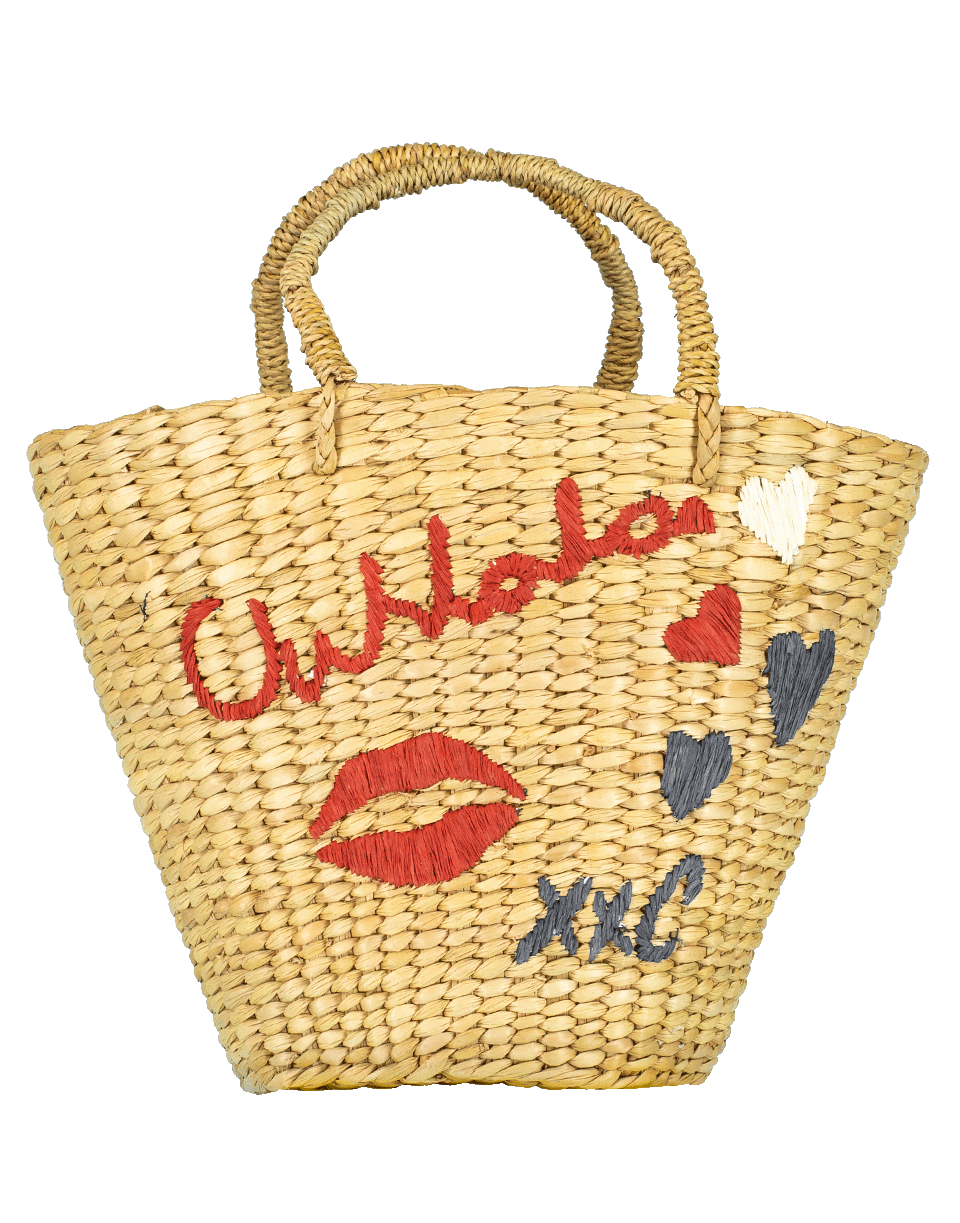 Small embroidered raffia basket bag from Camilla. This small Sea Grass woven basket is adorned with red, white and blue embroidery and finished with two top handles.