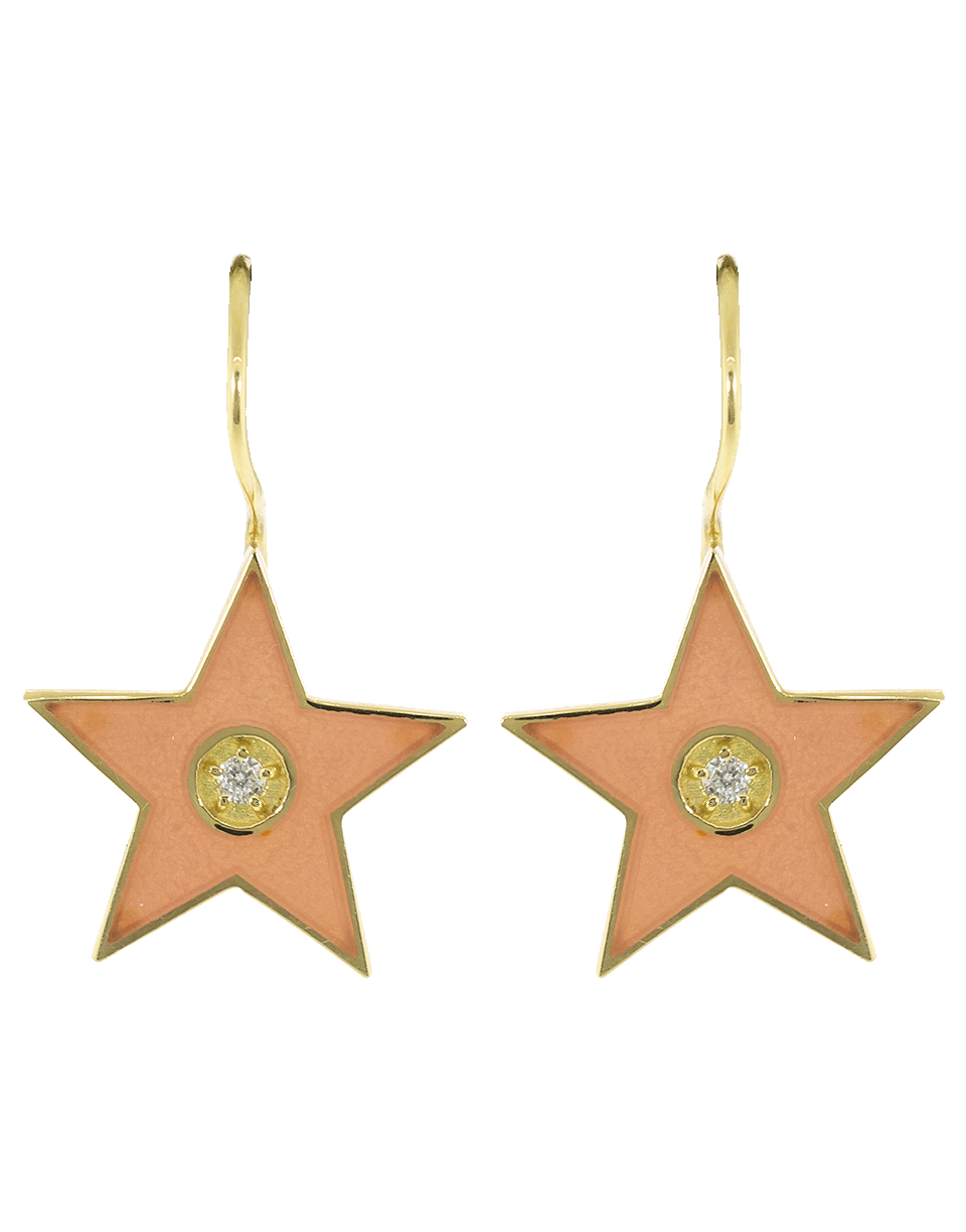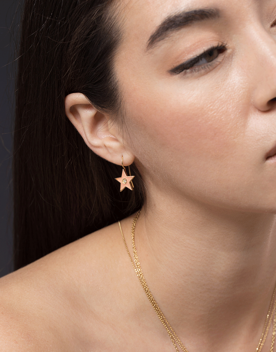 Andrea Fohrman 18k yellow gold pink French enamel star earrings with a white diamond star on French wire. For pierced ears.