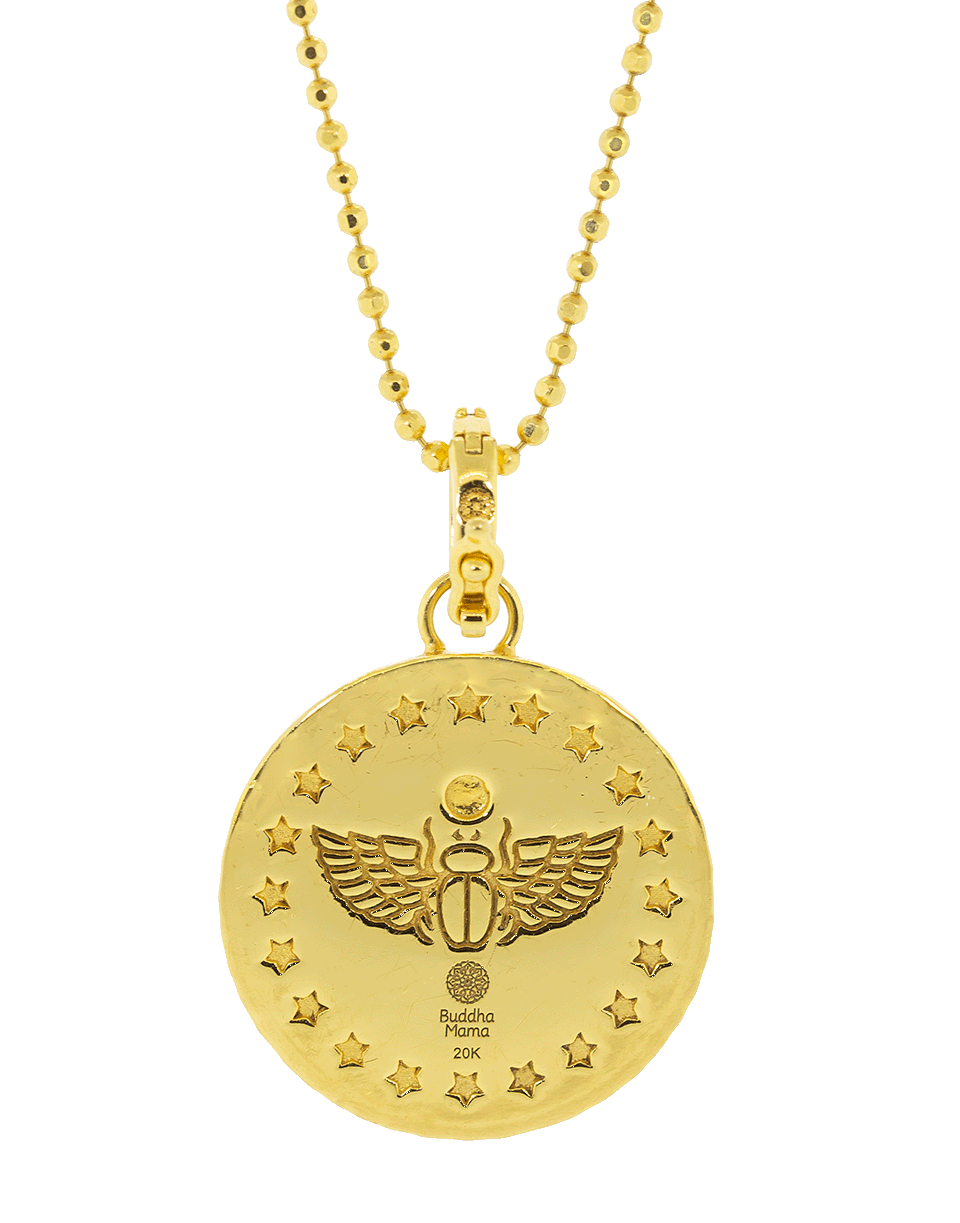 Buddha Mama Eye of Horus pendant set with red and black enamel. Diamond round in center of the eye and diamond square frame. Rear detail includes scarab and star gallery.