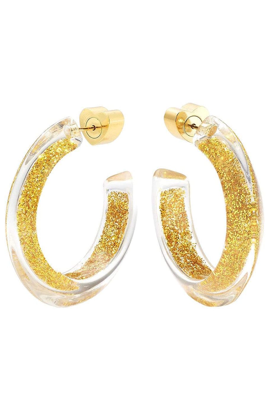 Lightweight small Alison Lou gold glitter jelly LOUCITE hoops crafted from clear lucite, hand-inlaid glitter, and brass plated 14k yellow gold posts and backs.