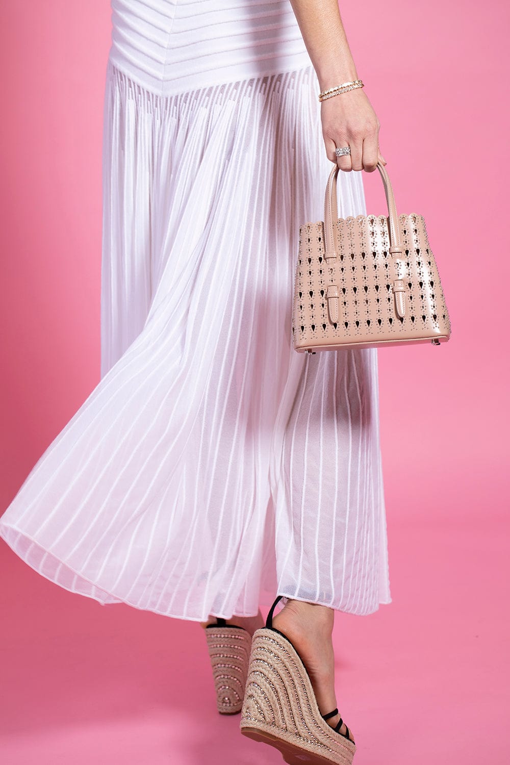 Inspired By Mina Rebuzzi Sozzani A Friend Of Monsieur Alaia Much Admired For Her Elegance, Mrs Sozzani Was Always Seen Carrying An Open Basket Bag. The Mina 16 In The Micro Size Is The Latest Addition To The Family And Is Perfect For Wandering Around. The Bag Has Snap-Fastening Gusseted Sides That Expand So You Can Fit All Of Your Essentials. The Bag Comes With A Detachable Leather Pouch. It Can Be Carried By Hand Or Worn As A Shoulder Bag Thanks To The Detachable Strap. Hardware Galvanized In Silver. Length: 16’ Height: 14’ Depth: 8‘