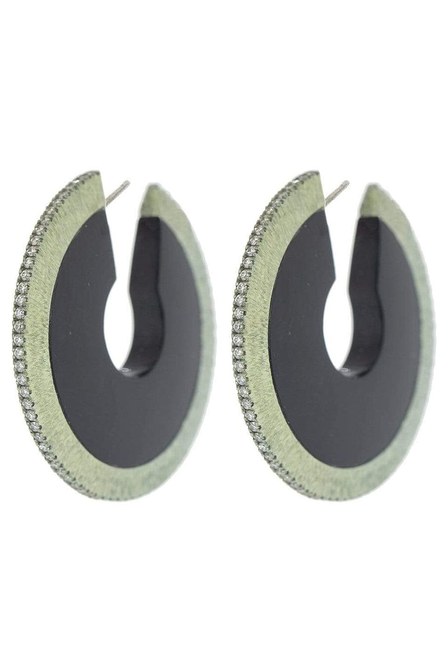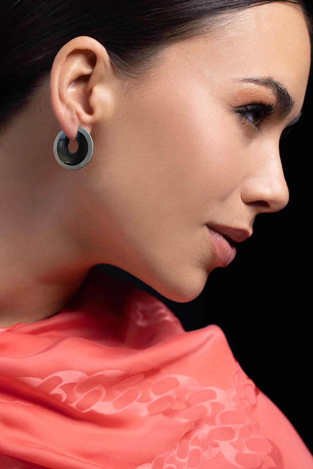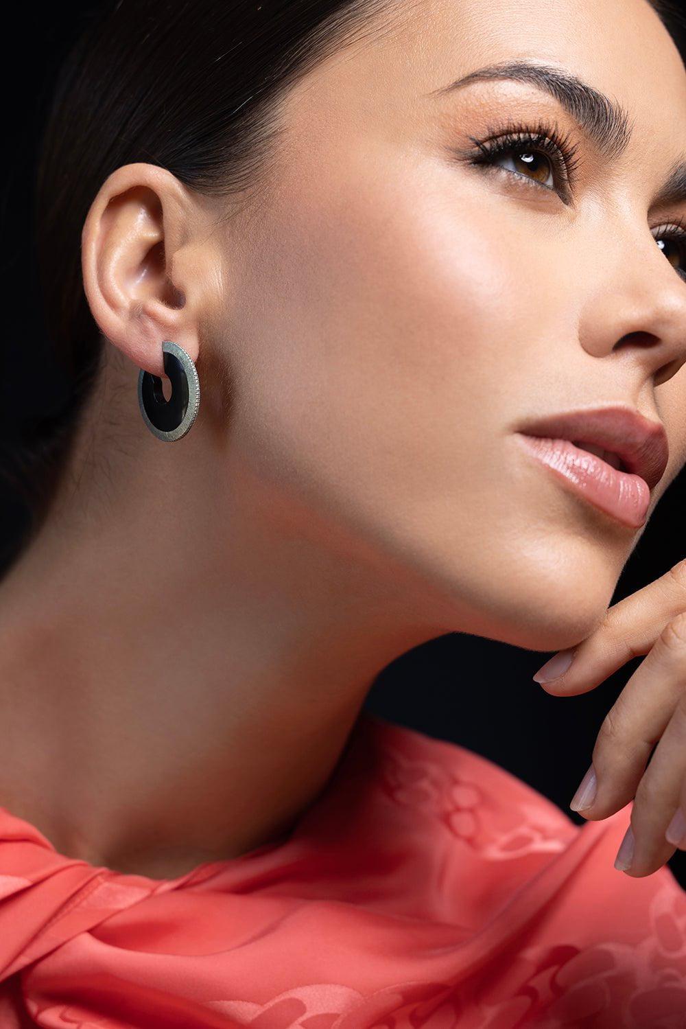 Arunashi small onyx circular hoops with diamonds set in 18k white gold. For pierced ears.