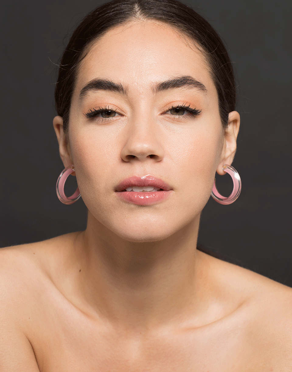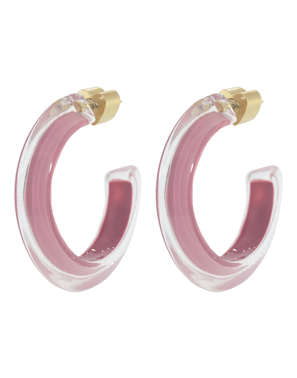 Super lightweight and the perfect addition to any look, the Alison Lou 'Loucite' hoops are hand-painted with rose pink enamel covered in clear Lucite and finished with brass plated 14k yellow gold backs and heart shaped posts.