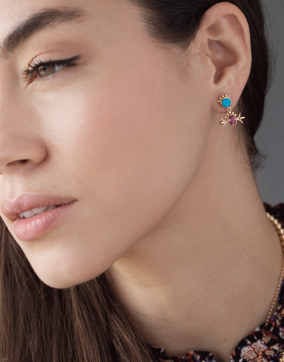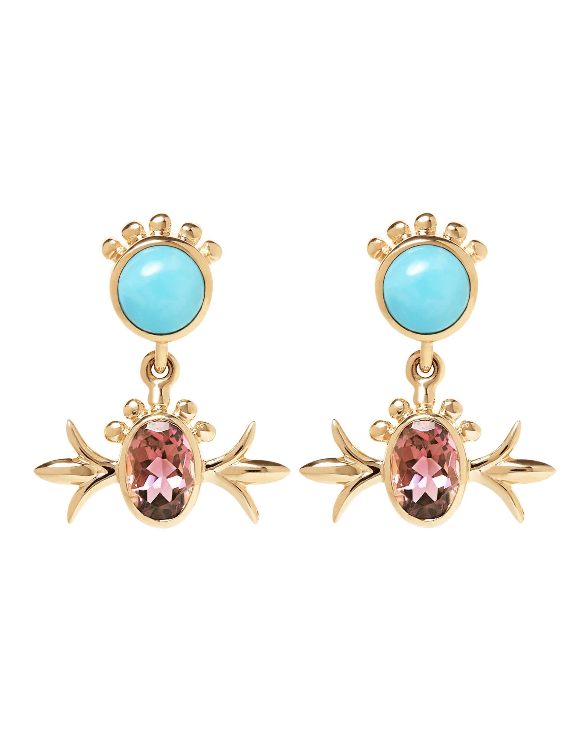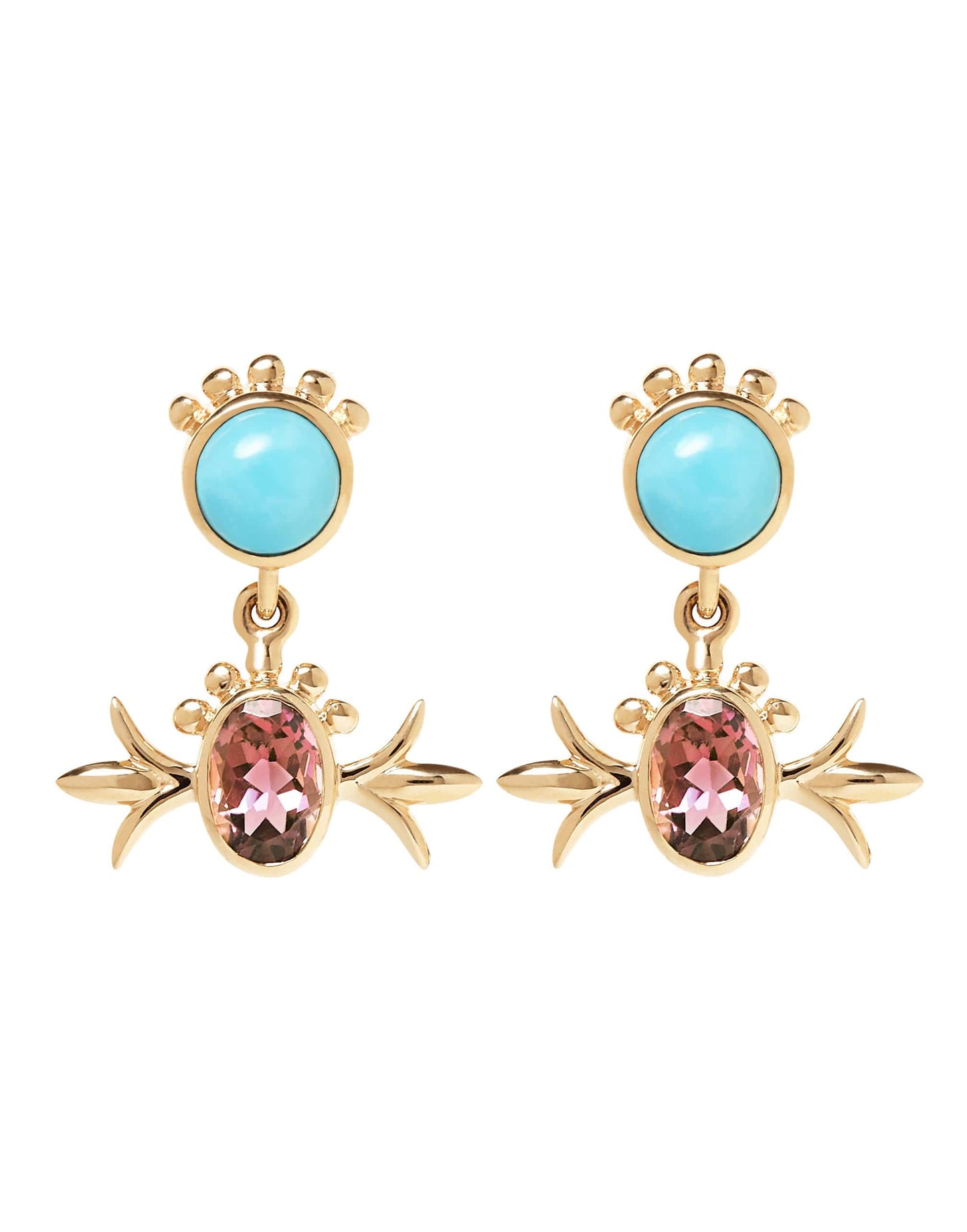 Marlo Laz squash blossom hanging stud earrings with turquoise and pink tourmaline. For pierced ears