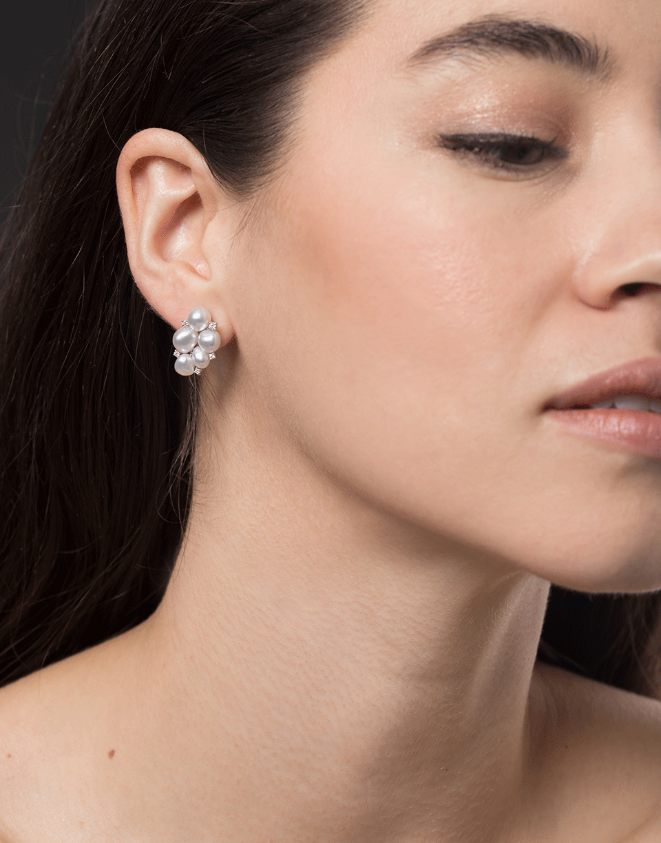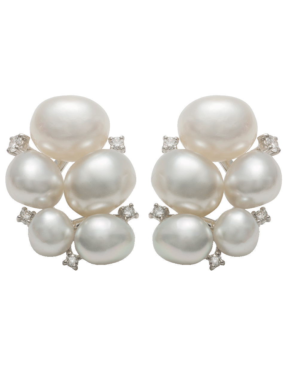 Baggins cluster stud earrings with white South Sea Keshi pearls and diamonds.