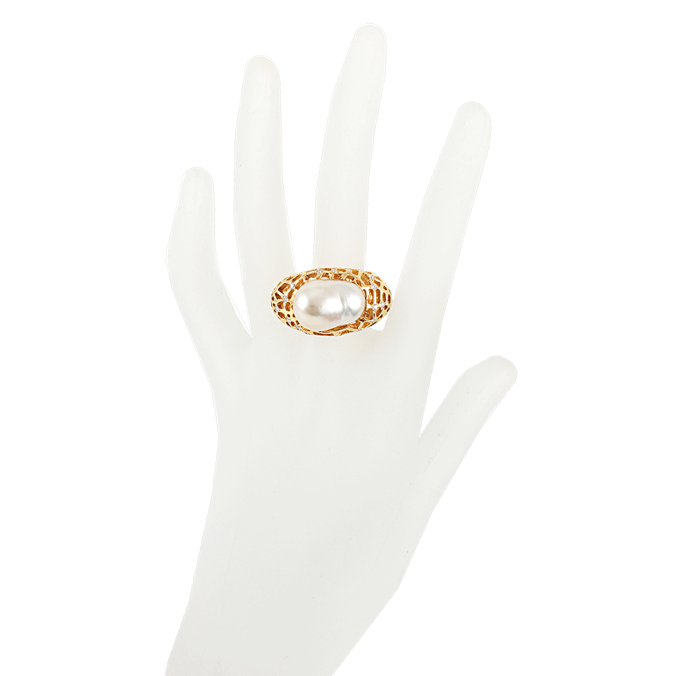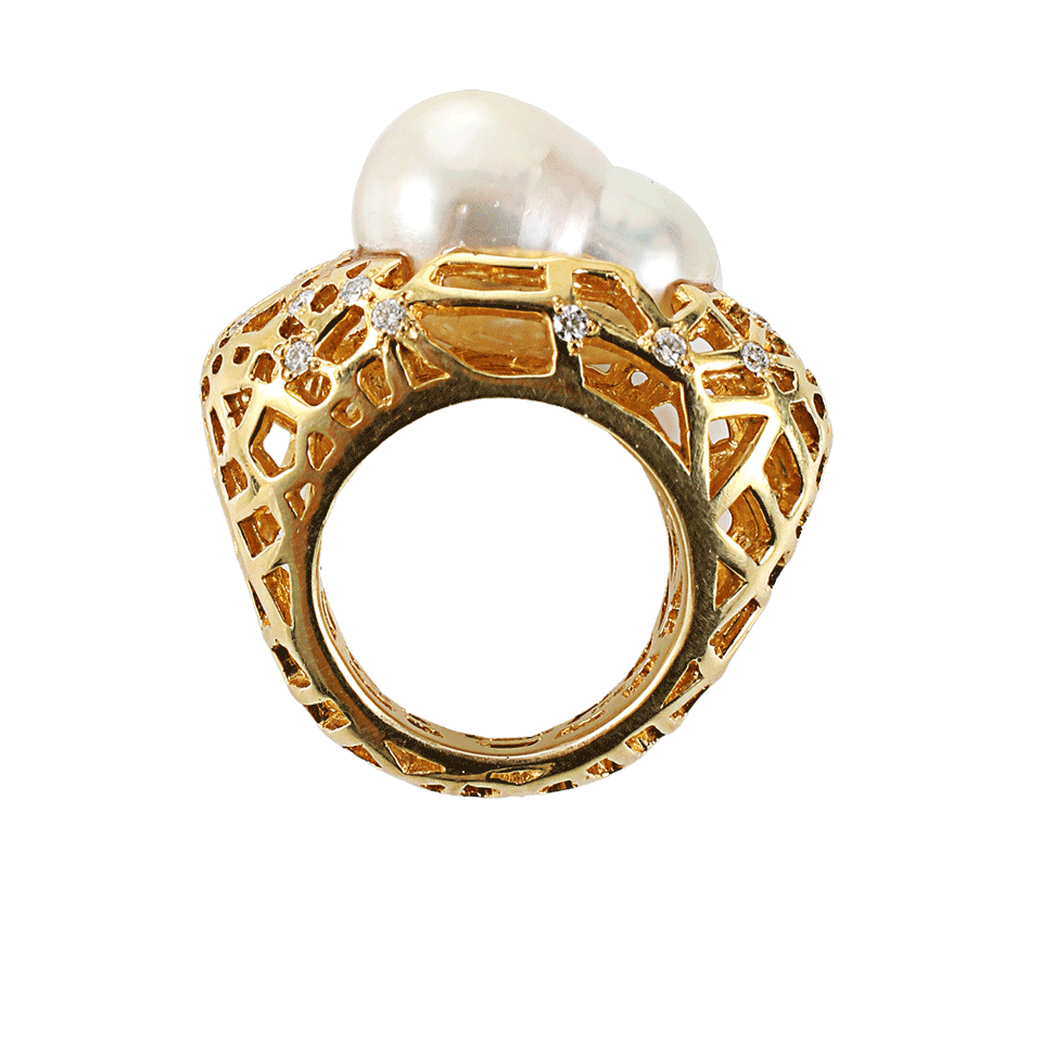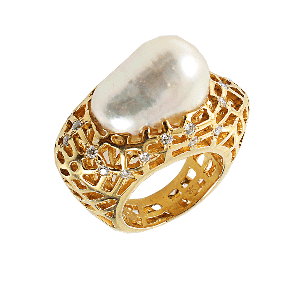 Get caught up in the hypnotizing beauty of this south sea pearl spider web ring by K. Brunini. The warmth of the gold against the organic pearl is truly spellbinding and will be a piece to treasure for a lifetime.