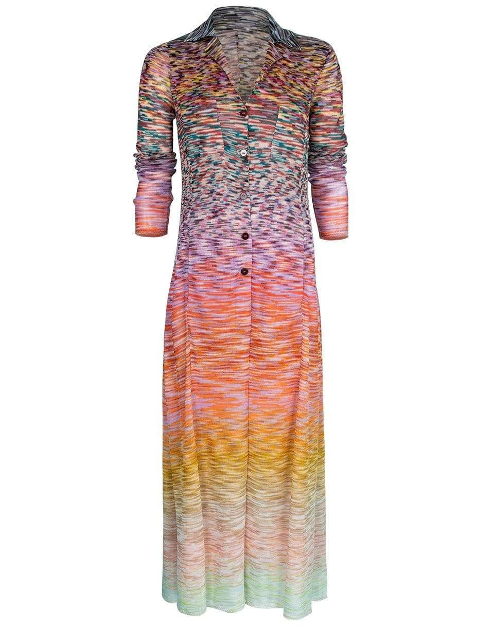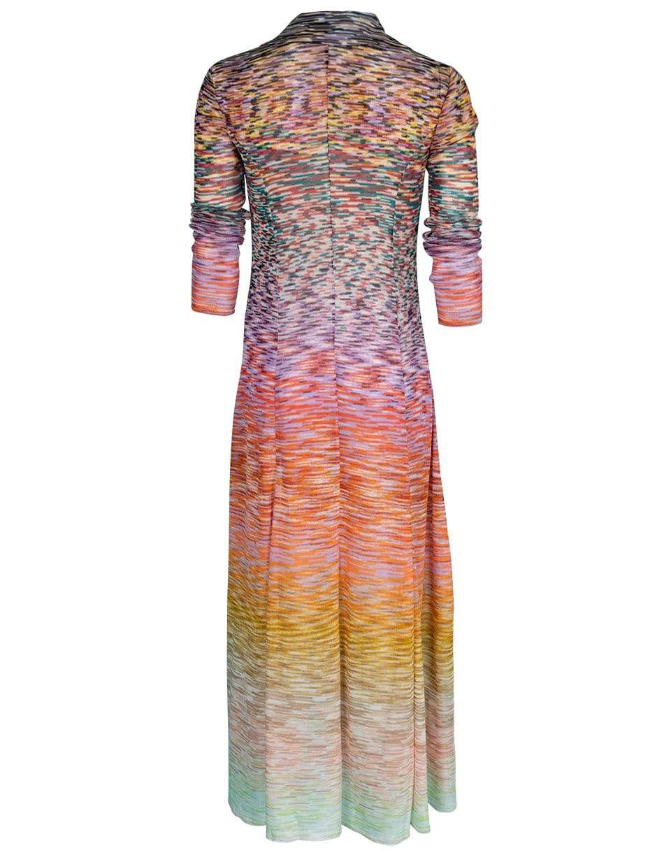 Missoni space dye long collared cardigan with a slim fit, long sleeves, patch chest pockets, half button front, and a calf length.