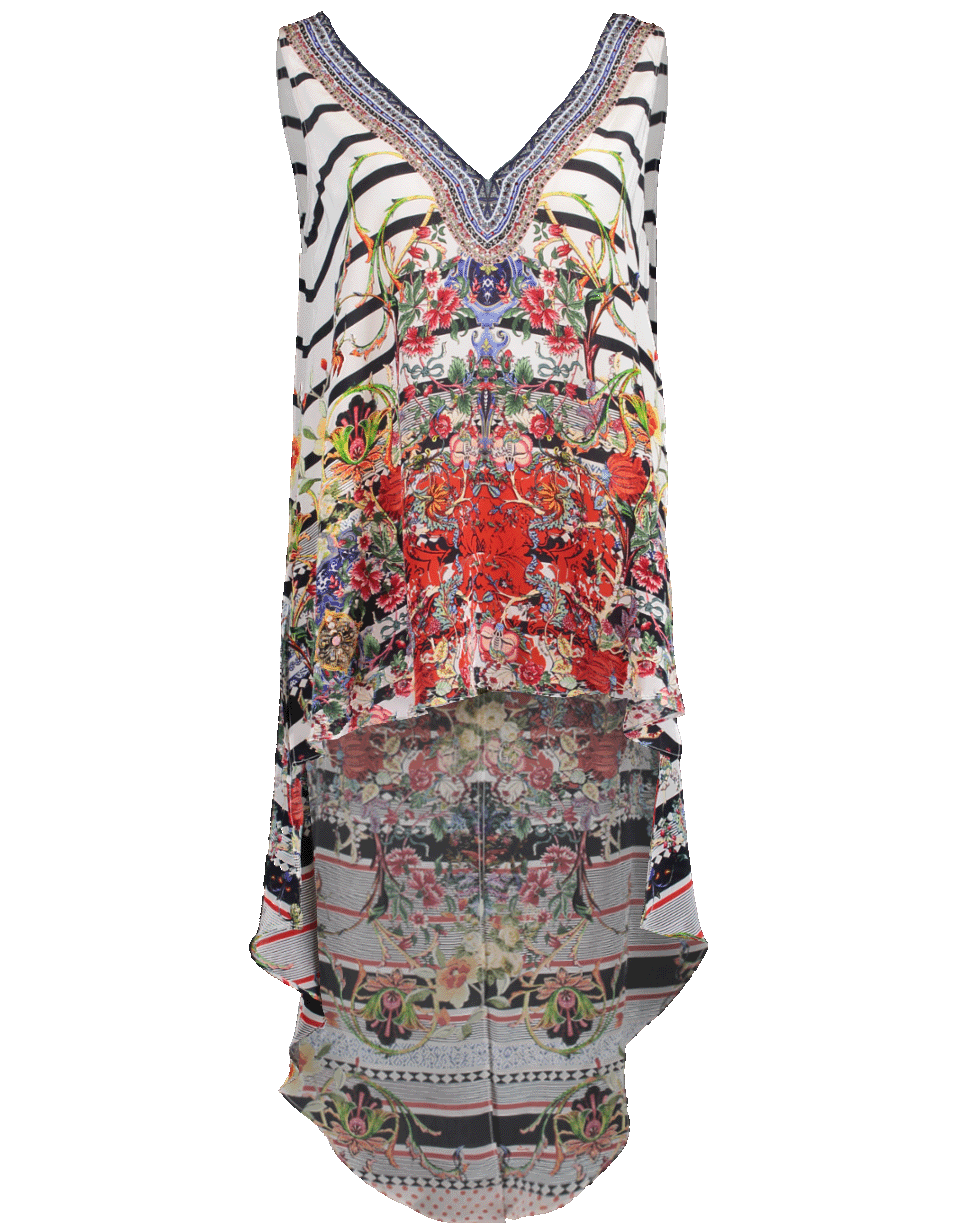 Spilt back V-neck printed top by Camilla. This sleeveless silk top features a bejeweled v-neckline, slipover style, high low hem, side splits, relaxed fit, and a floral and stripe design with crystal embellishment.